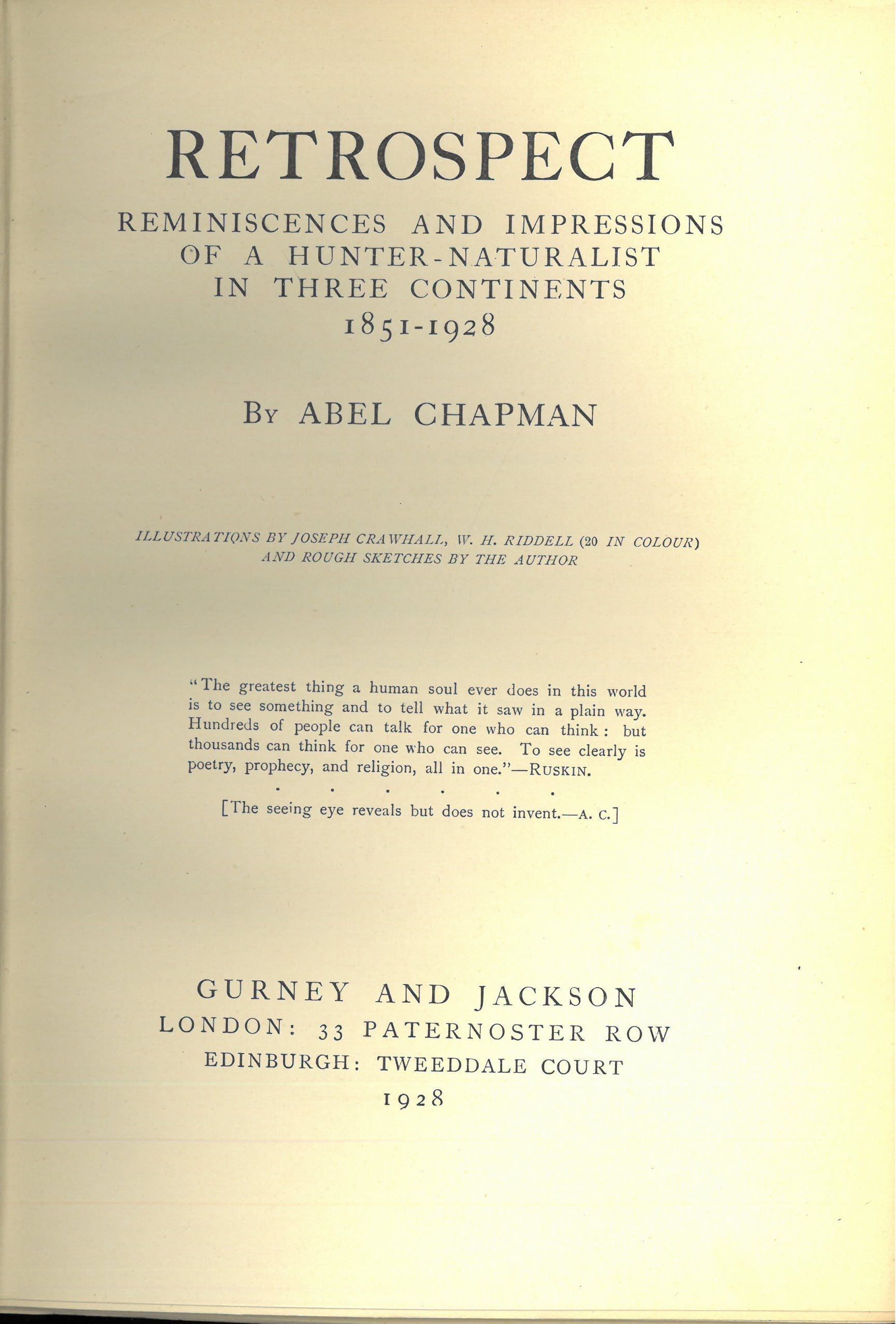 Retrospect. Reminiscences and impressions of a hunter-naturalist in three continents 1851-1928. Illustrations by Joseph Crawhall, W. H. Riddell (20 in colour) and rough sketches by the author.