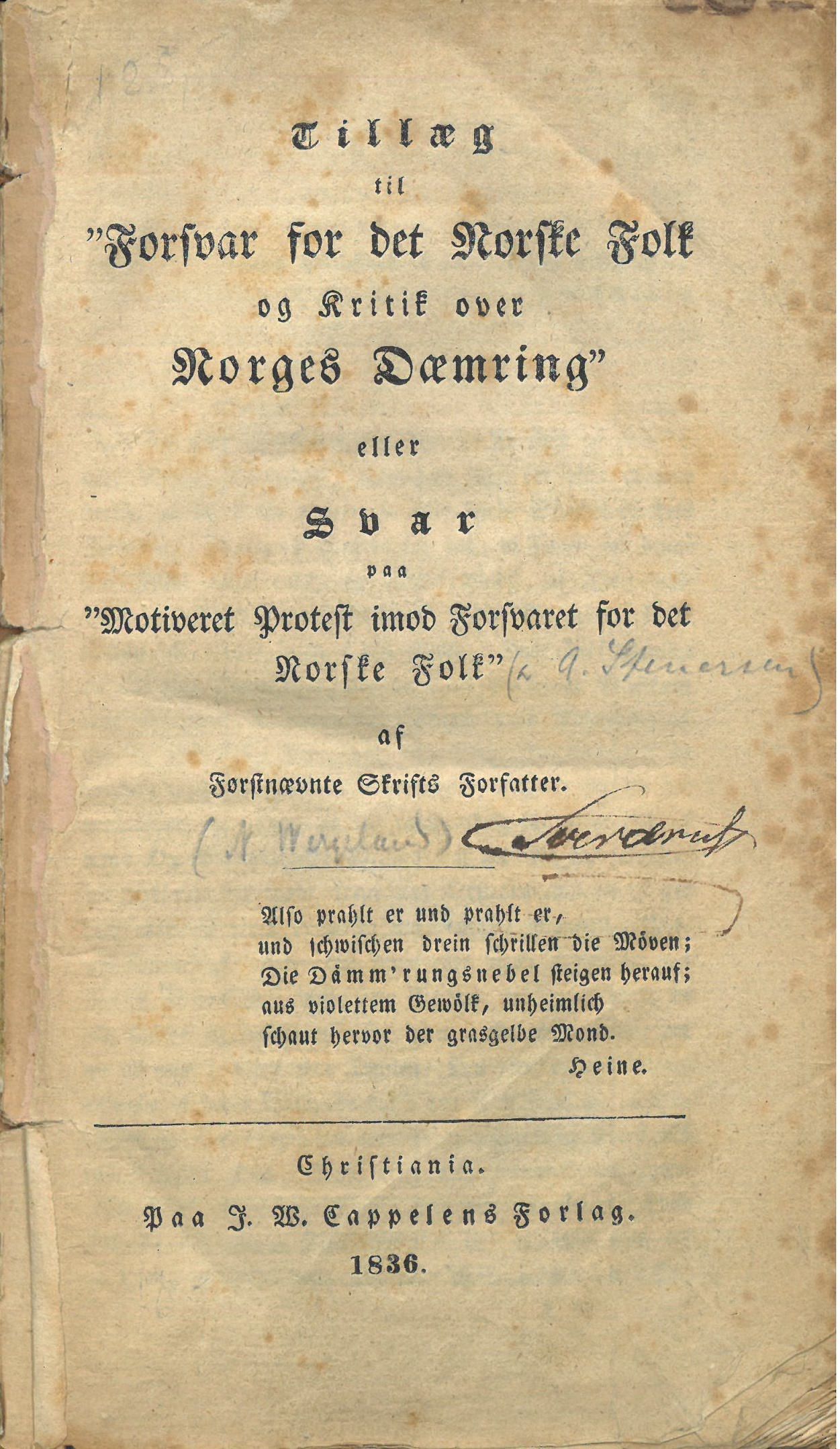Tillæg til “Forsvar for det Norske Folk og Kritik over Norges Dæmring” eller Svar paa “Motiveret Protest imod Forsvaret for det Norske Folk” af Førstnævnte Skrifts Forfatter.