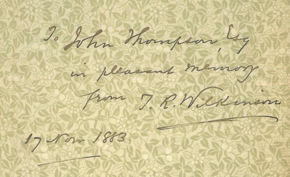 Schiötz 1175 **. Med etikett : “This volume was printed for private circulation only, but I have been urged so repeatedly to publish it that I have placed copies for sale in the hands of Mr. Day, Bookseller, Market Street, Manchester. T. R. W.” Med dedikasjon fre Wilkinson på forsatsen. Liten slitasje ved øvre kapitél.
