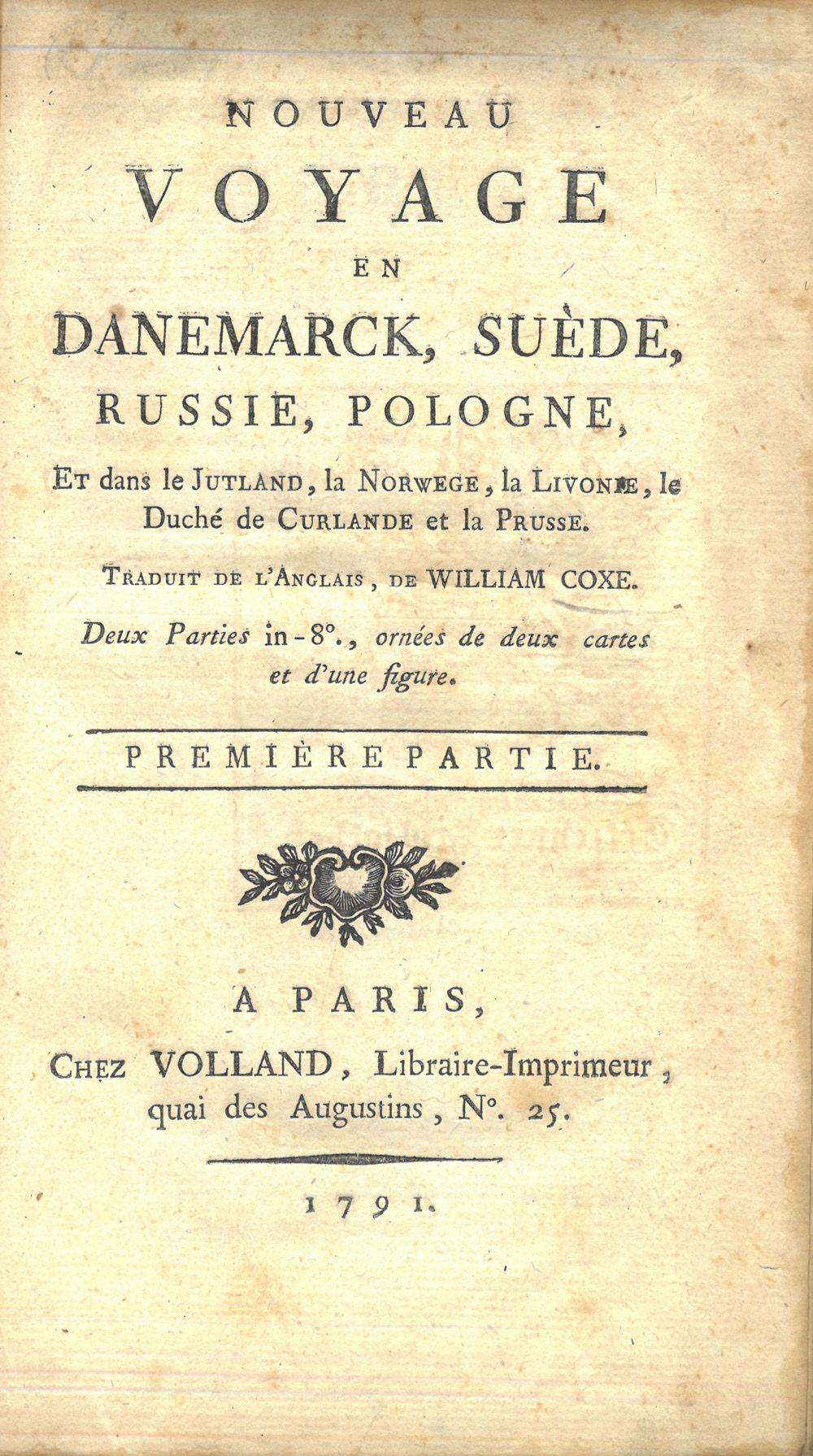 Nouveau voyage en Danemarck, Suède, Russie, Pologne, Et dans le Jutland, la Norwege, la Livonie, le Duché de Curlande et la Prusse. Traduit de l'Anglais, de (...). Deux Parties in 8vo, ornées de deux cartes et d'une figure. I-II