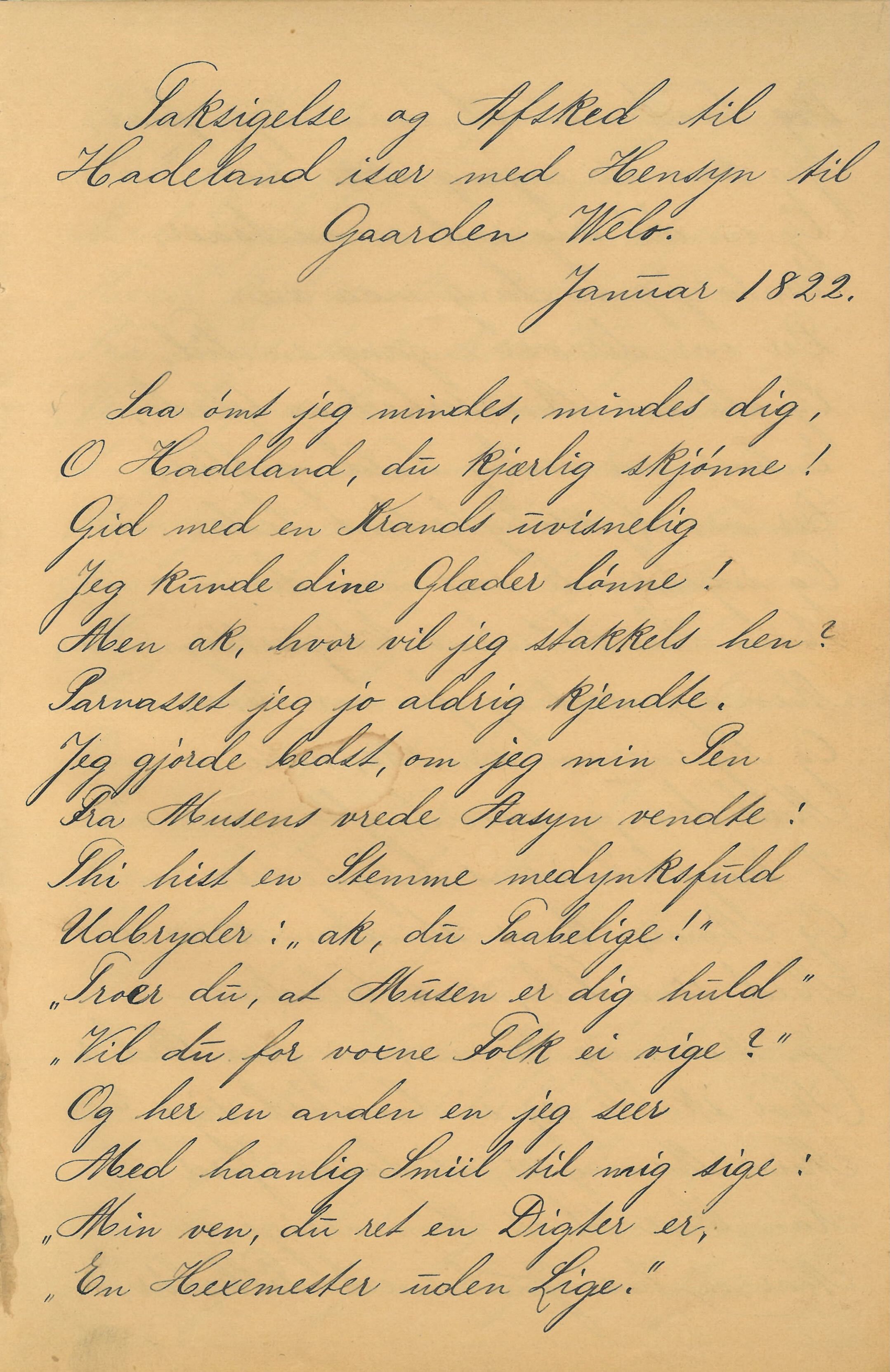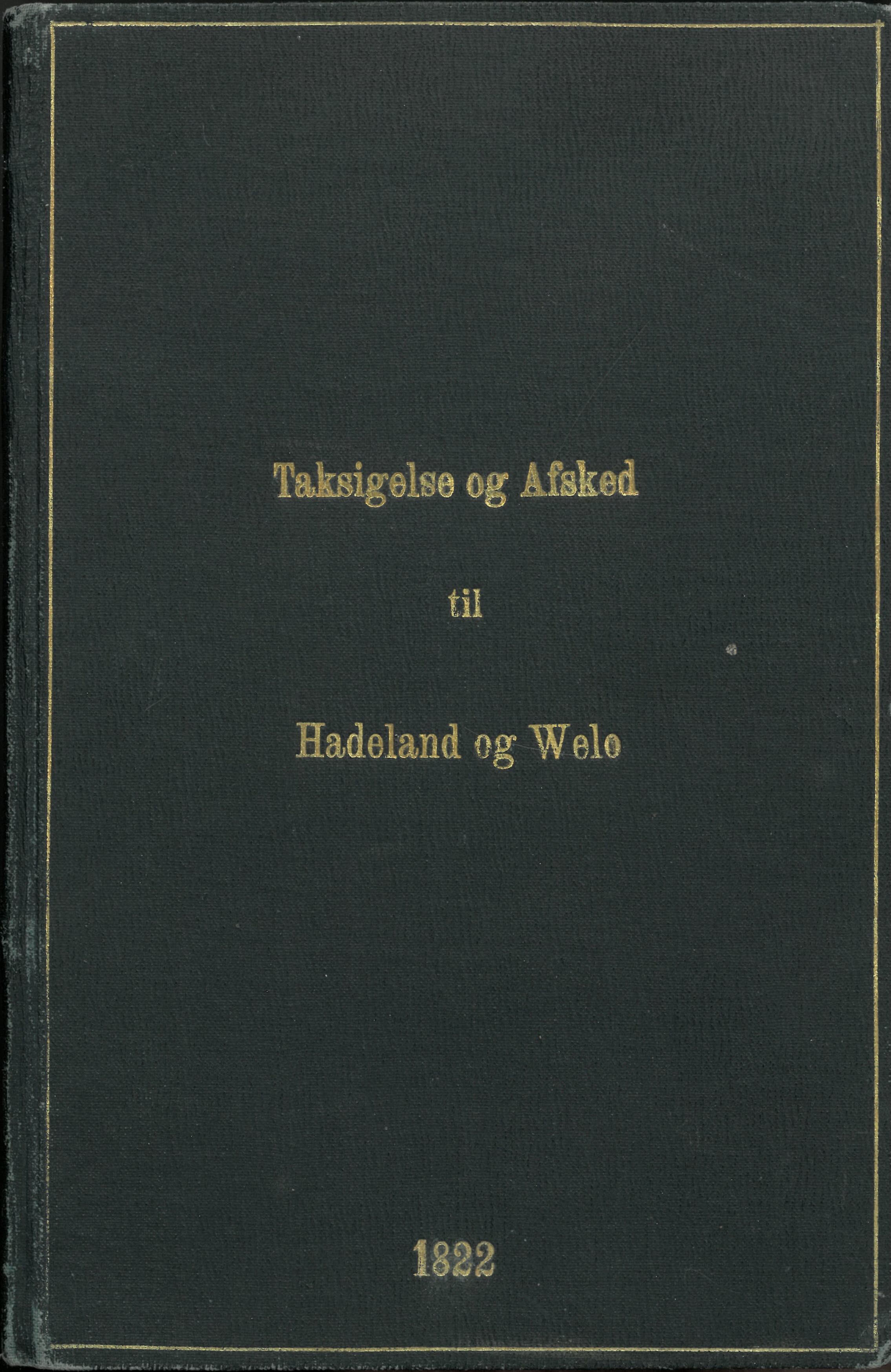 Taksigelse og Afsked til Hadeland især med Hensyn til Garden Welo. Januar 1822. Sent 1800-talls avskrift av originalen.