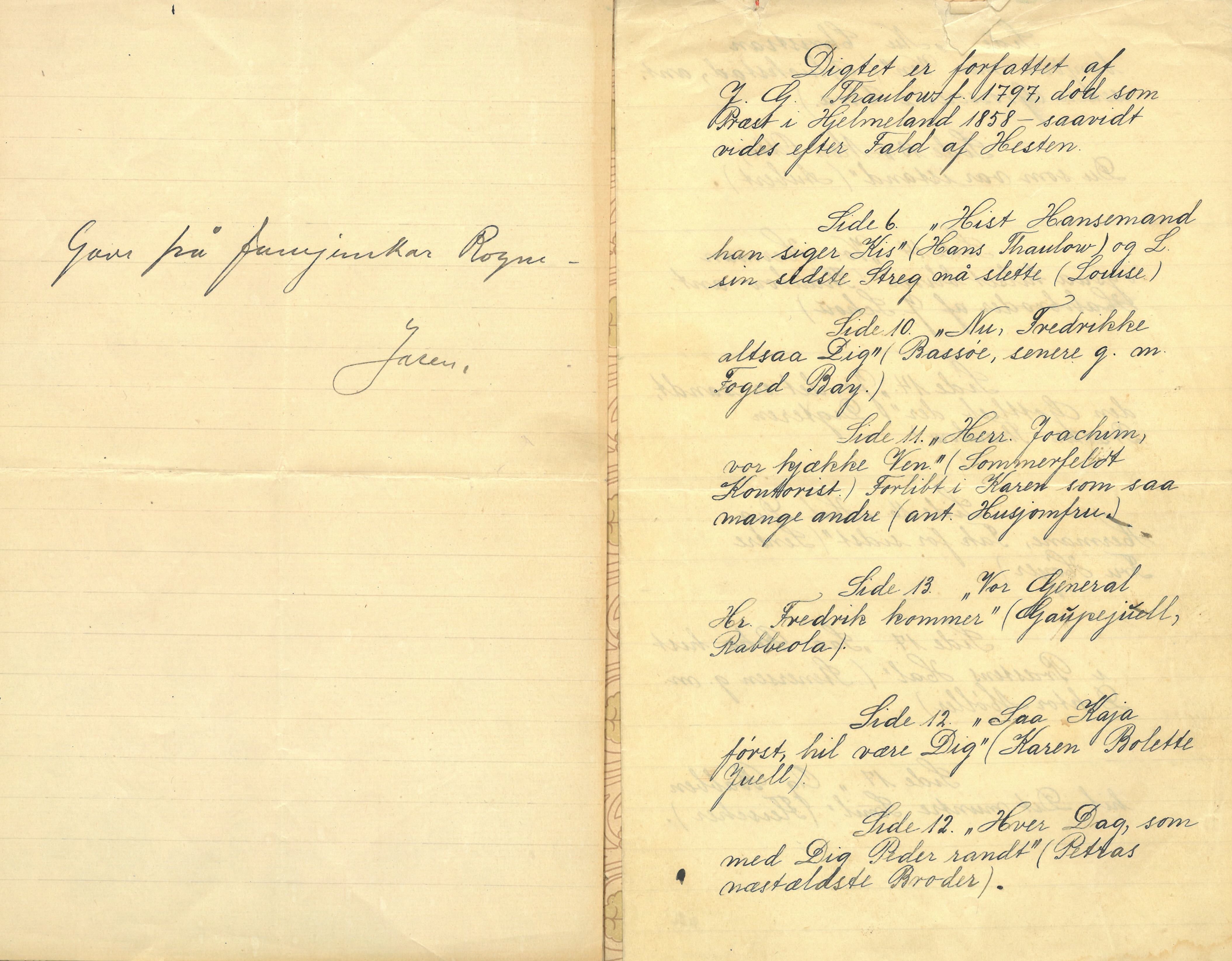 “Digtet er forfattet af J. G. Thaulow f. 1797, død som Præst i Hjelmeland 1858 - saavidt vides efter Fald af Hesten”. Det ene arket med påskrift “Gave fra fanejunker Rogne - Jaren”.