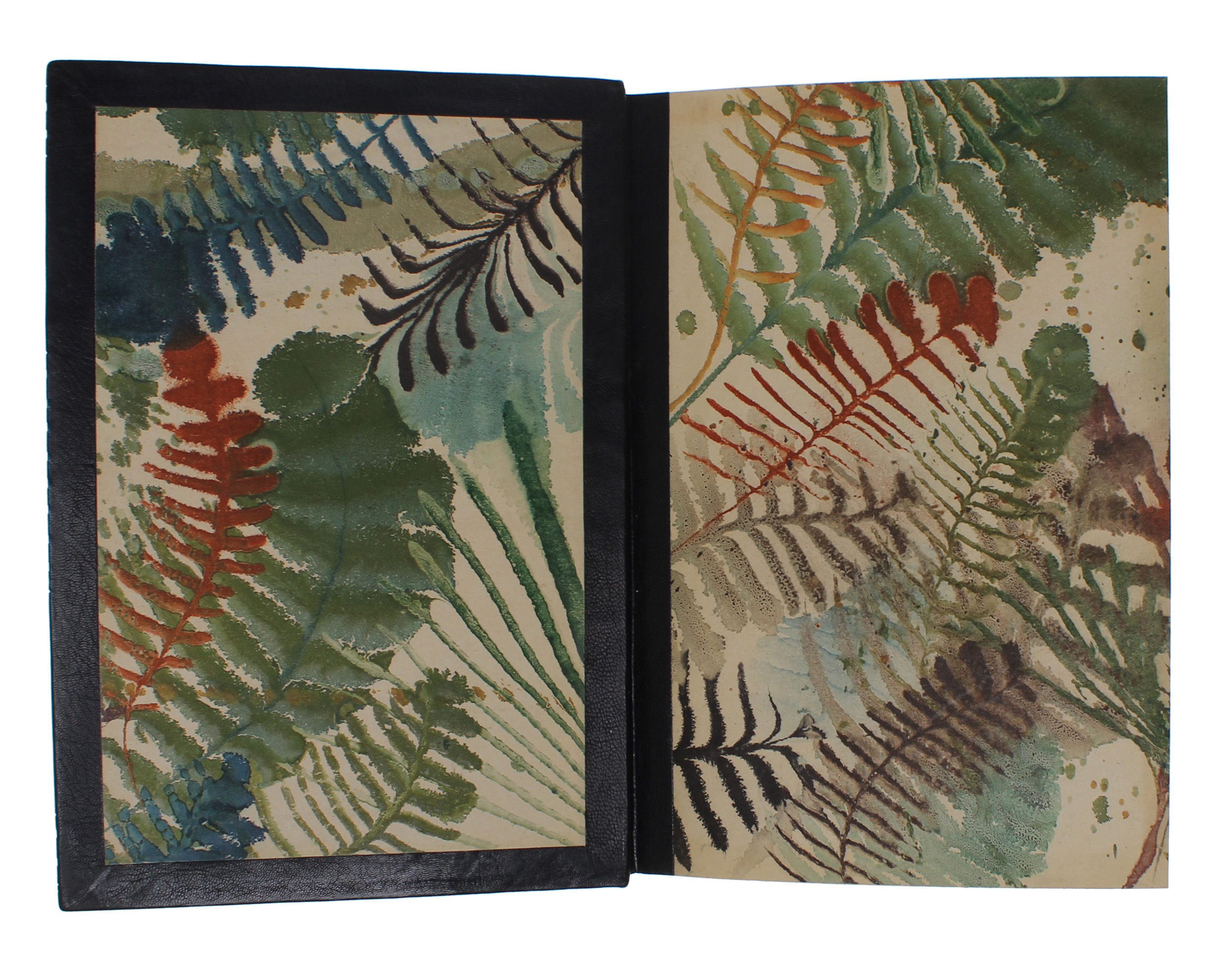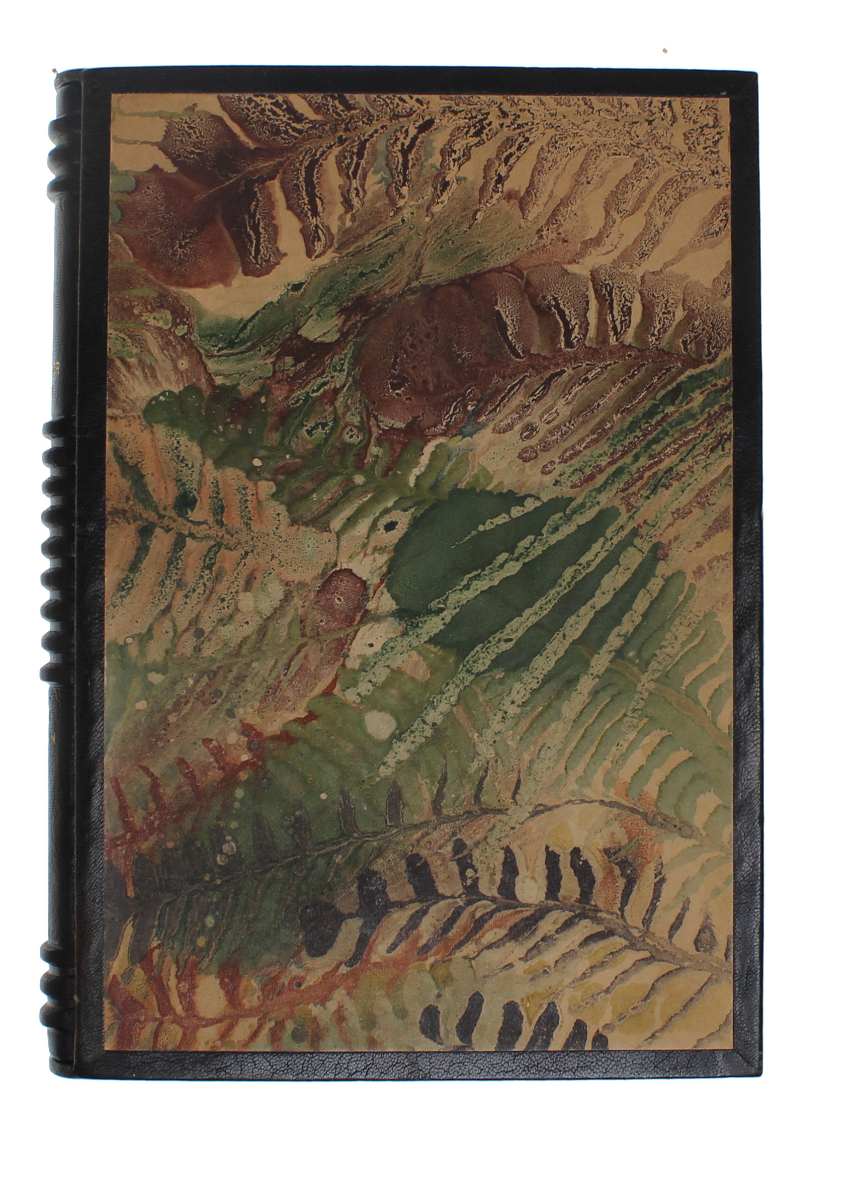 Odense, Skandinavisk Bogforlag, 1938. Stor 8vo. (25 x 18 cm.). Indbundet med de originale omslag, også ryggen, i et nydeligt yderst velbevaret hellæderbind i sort maroquin. Med dekorative ophøjede bind på ryg; rygdekorationen fortsætter på for- og bagperm, som blindtrykt stregdekoration. Forfatter og titel i guld på ryg. Dekorerede fortsatpapirer. Rødt topsnit, ellers ubeskåret. Også indvendig meget ren og frisk, trykt på godt kraftigt papir. Gammelt ejernavn i blyant på det forreste friblad. Indlagt i kassette af sort halvmaroquin med dekoreret papir på siderne, svarende til forsatsene.