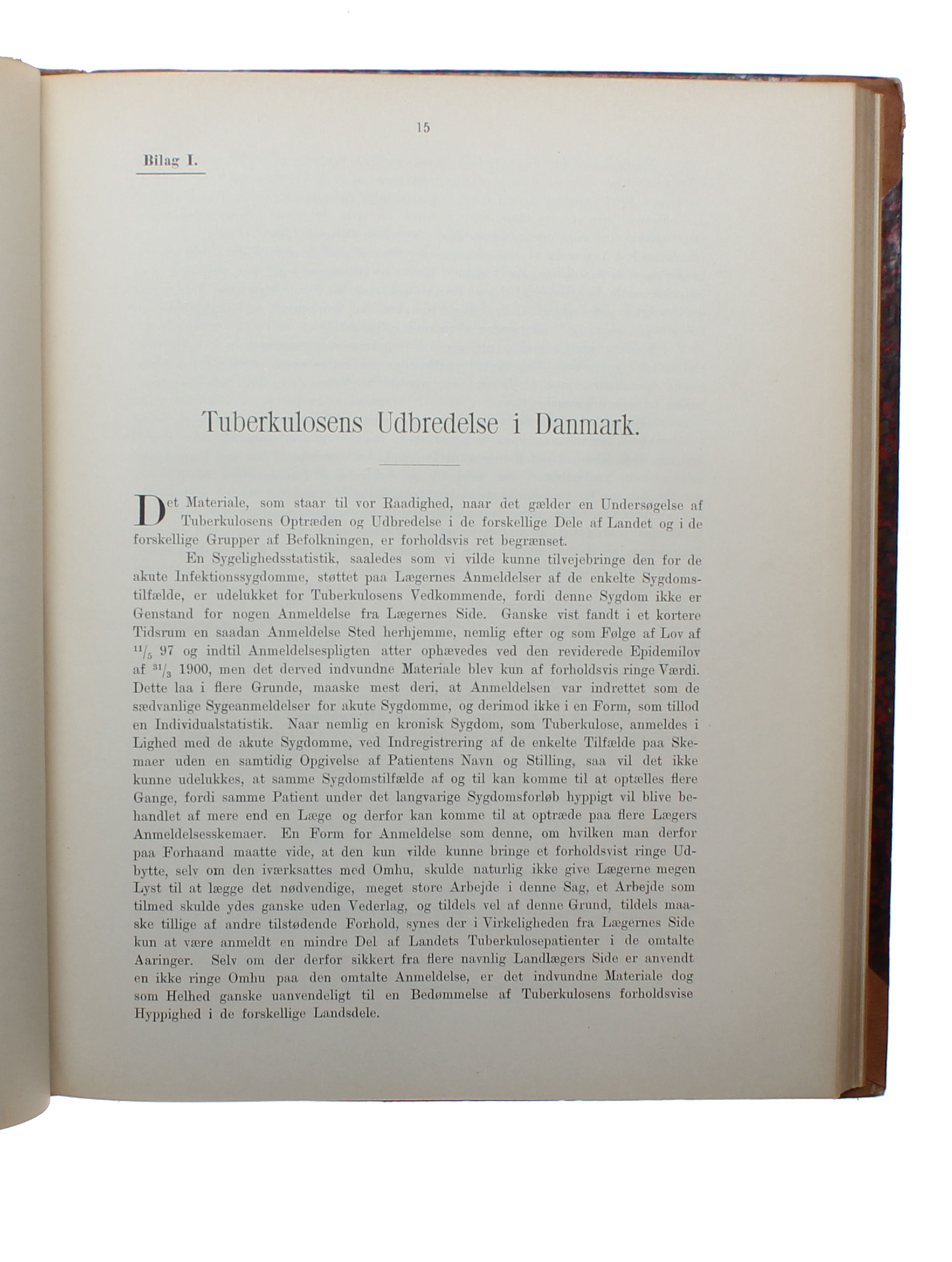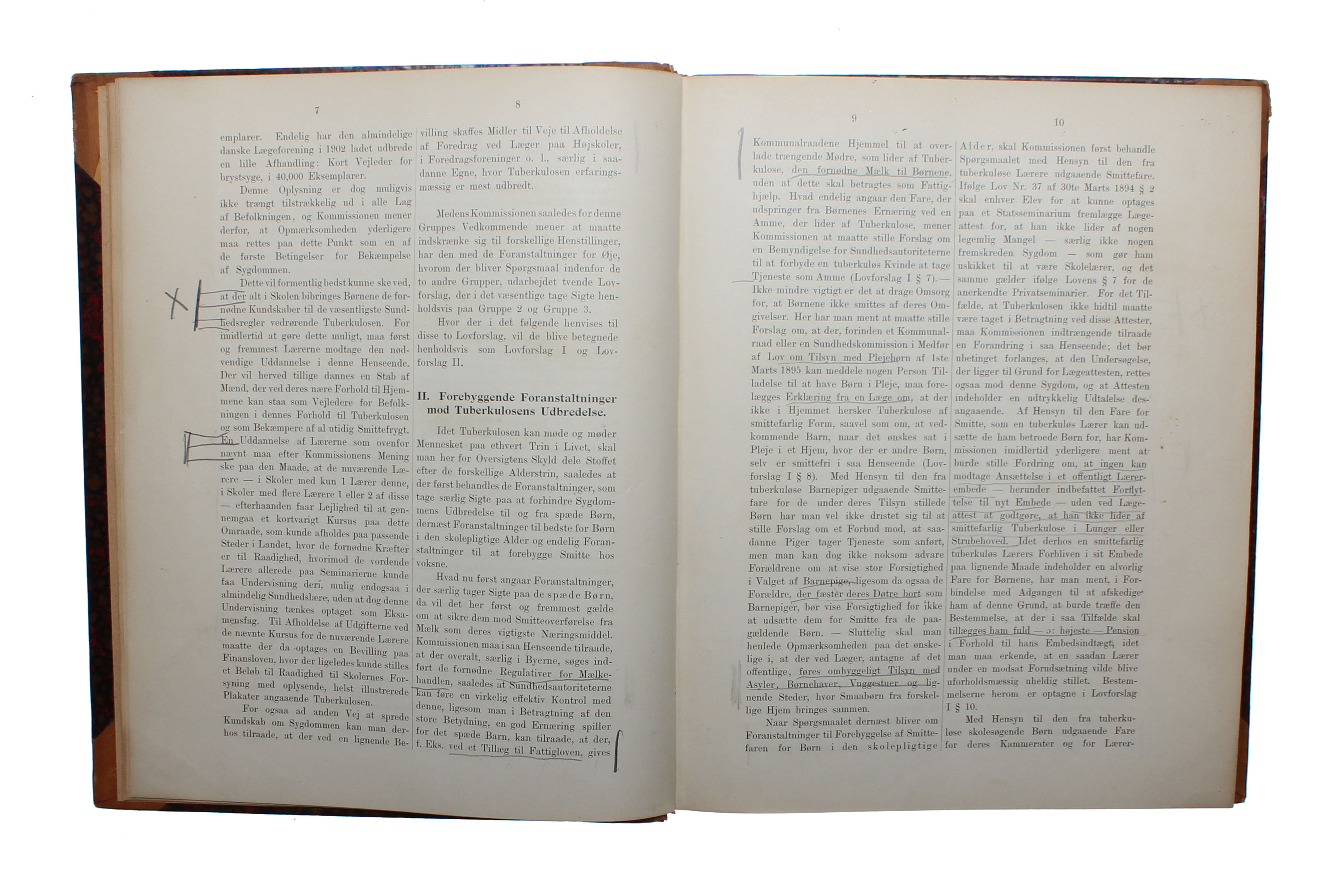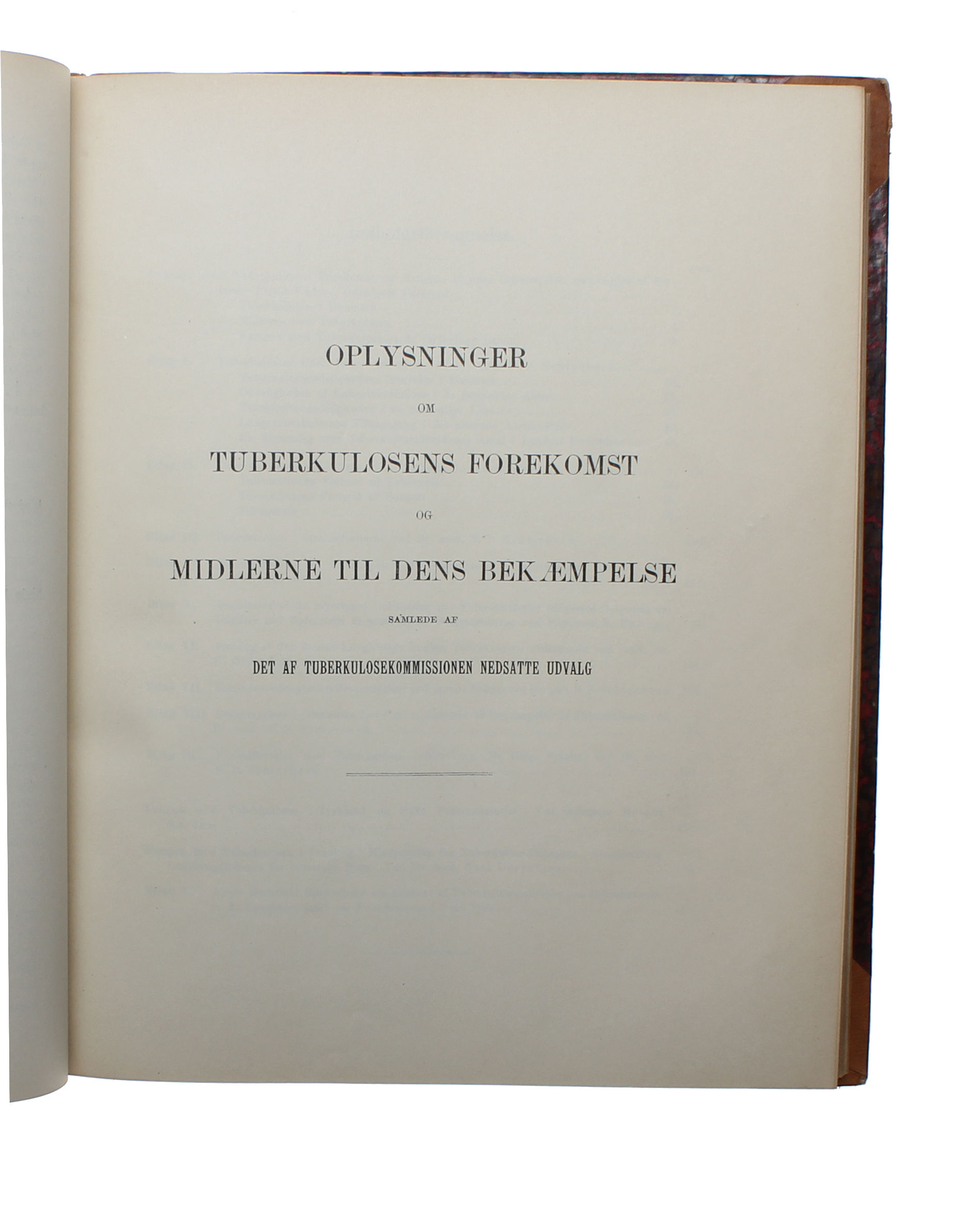 Rare first appearance of the report from the Danish Royal Commission of 18th November 1901 on how to prevent and cure tuberculosis. The commissions work had profound influence on the spread of tuberculosis and in particular the death rate which dropped dramatically. "In 1901, a national society for the prevention of tuberculosis was stated in Denmark, which now has ten sanatoria, and the results of the very comprehensive measures adopted have been so good that Denmark has long held second place to New Zealand in having the lowest tuberculosis mortality." (New Zealand, Parliamentary Debates, 1948).