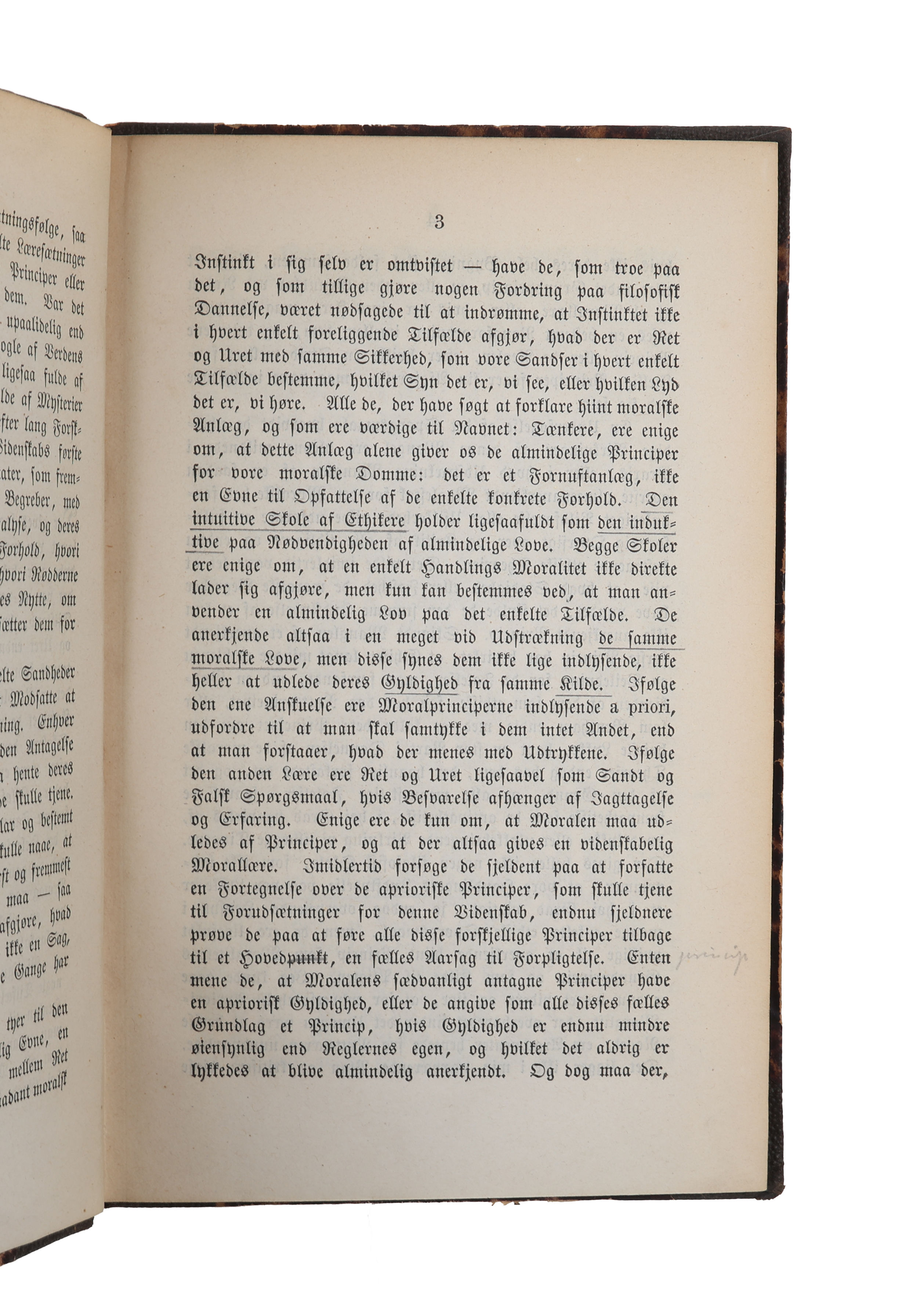 Scarce first edition of the first Danish translation of Mill’s seminal “Utilitarianism”, translated by the great Georg Brandes and with the most excellent provenance, namely that of the founder of the welfare principle, which laid the groundwork for the welfare state as we know it today, Harald Høffding, with his numerous handwritten notes, annotations, and markings, and later given to someone by Høffding’s pupil, the important Danish philosopher Frithiof Brandt. Mill’s “Utilitarianism” constitutes a classic within the field of moral and political thought and is considered "the most influential philosophical articulation of a liberal humanistic morality that was produced in the nineteenth century." (Encycl. Of Philosophy). Originally published as a series of three separate articles in 1861, it was collected and printed as a single work under the canonical title in 1863. This publication is now considered the classic exposition and defense of Utilitarianism in ethics, a revolution within moral philosophy. The work was translated into Danish by the immensely influential literary critic Georg Brandes, by many considered the greatest intellectual of his time. Brandes played a key role in introducing especially German and British thought to Scandinavia, most notably the works by such thinkers as Darwin and Nietzsche. He is also the first to translate Mill’s works and make them accessible to a Scandinavian readership. His translation of “Utilitarianism” appeared in 1872 and was responsible for spreading the utilitarian philosophy to a wider audience in the North, indirectly - through Høffding - contributing to the formation of the welfare state that the Scandinavian countries are so famous for. It was through the reading of primarily Mill and Bentham that Harald Høffding came to develop his welfare principle, a principle that he is the first in the world to work out, and the principle upon which the modern welfare state is founded. He is primarily inspired by Mill’s Utilitarianism, but comes to largely replace the conceptions of utility and happiness using instead the welfare principle as a specification of the yardstick that must be used to evaluate actions. “The object of the welfare-principle is not the individual or momentary inclination, rather the lasting vital necessities of the human race, and therefore it places the point of judgment at the effects of an action.” (Thyrring Andersen, p. 105). “In the abandonment of the Christian ethics, positivism had to try to give the grounds for a morality which does not seek refuge with a divine authority. The contribution of Harald Høffding lies in a continuation of the utilitarianism in Jeremy Bentham and John Stuart Mills, whose normative theories on ethics claim that the correct ethically is the one that compared to the other options produces the greatest amount of positive values. And that means that the ethical values of an action depend on its ability to increase the amount of happiness. The principle of utility is formulated this way: The greatest possible happiness for the greatest possible number of people. Among the problems in this ethics are how different forms of values can be compared, which yardstick they can be measured by, and how a just and/or fair distribution of boons can be based.” (Thyrring Andersen, p. 104). Høffding had his starting point in Utilitarianism, but he transcended the more narrow principle of happiness. His welfare principle does not identify the supreme good with the happiness of the individual, “but considers the utmost purpose of being as the appearance of men of sterling characters, who have a feeling of happiness in working for the common good. … a decisive precondition of this was the commandment concerning charity in the Gospels and the historical development of this in Christianity.” (Thyrring Andersen, p. 109). Georg Brandes was the leading intellectual of his time in Denmark and must be credited with bringing European thought to Scandinavia, not only through his incredibly popular and famous lectures, but also through his own writings and not least through his translations of the most important works of the period into Danish. In Denmark, Brandes was synonymous with “the modern breakthrough” and therefore, for most, also the symbol of democracy and what we today would call welfare-thinking. At a closer look, however, Brandes was also in many ways an anti-democrat and so influenced by the thoughts of Darwin and especially Nietzsche that his views came to be very much opposed to those of a society based on a welfare principle that Høffding came to develop. “[I]t was Høffding who was the first in the world to work out a welfare-principle, namely in his “Etik” (Ethics) in 1887. Today, Høffding is not widely known, but in his lifetime and up to the 1950ties he was an internationally famous philosopher, whose works were translated into many languages and who was several times nominated for the Nobel Prize.” (Andersen, A.T.: The Dialogic and Religious Theme of Welfare in Harald Høffding…, p. 104). His great work "Etik", in which he developed the welfare-principle, constitutes an ethical system. Here, Høffding discusses the principal questions in order to develop a scientific ethics, or a moral science if one will, analyzes the ethical principles that are expressed in ethical assessments, and on the basis hereof develops an individualistic and a social ethic that was way ahead of its time, but which found great resonance within the reading public. The book had an enormous impact. It appeared five times in Høffding’s life-time, sold extremely well, and was quickly translated into German and French – “Denmark had gotten its first internationally known and acknowledged philosopher, several decades before Kierkegaard had his breakthrough on the international scene.” (Koch, Dansk filosofi i positivisments tidsalder, p. 41 – translated from Dani