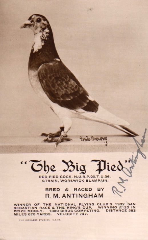 Red pied cock, N.U.R.P. 29. T.U. 36. Strain, Worswick Blampain. Bred and Raced by R. M. Antingham. Winner of Tne National Flying Club’s 1932 San Sebastian Race .... Velocity 747.