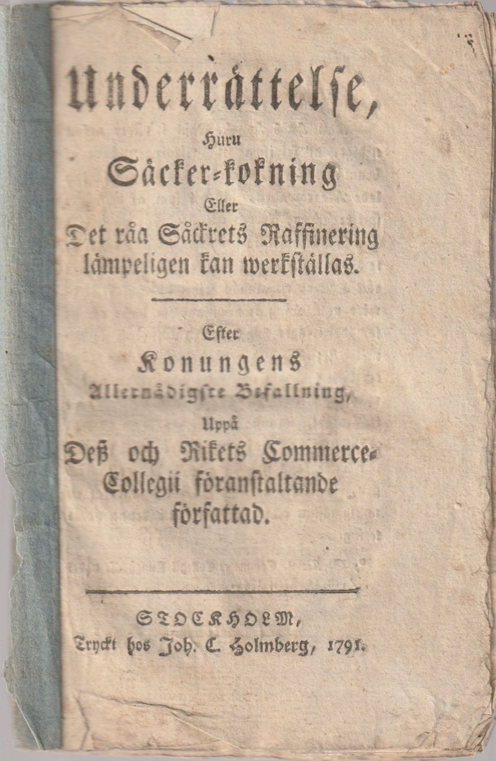 Underrättelse, hru Såcker-kokning eller Det råa Såckrets Raffinering lämpeligen kan werkställas (...)