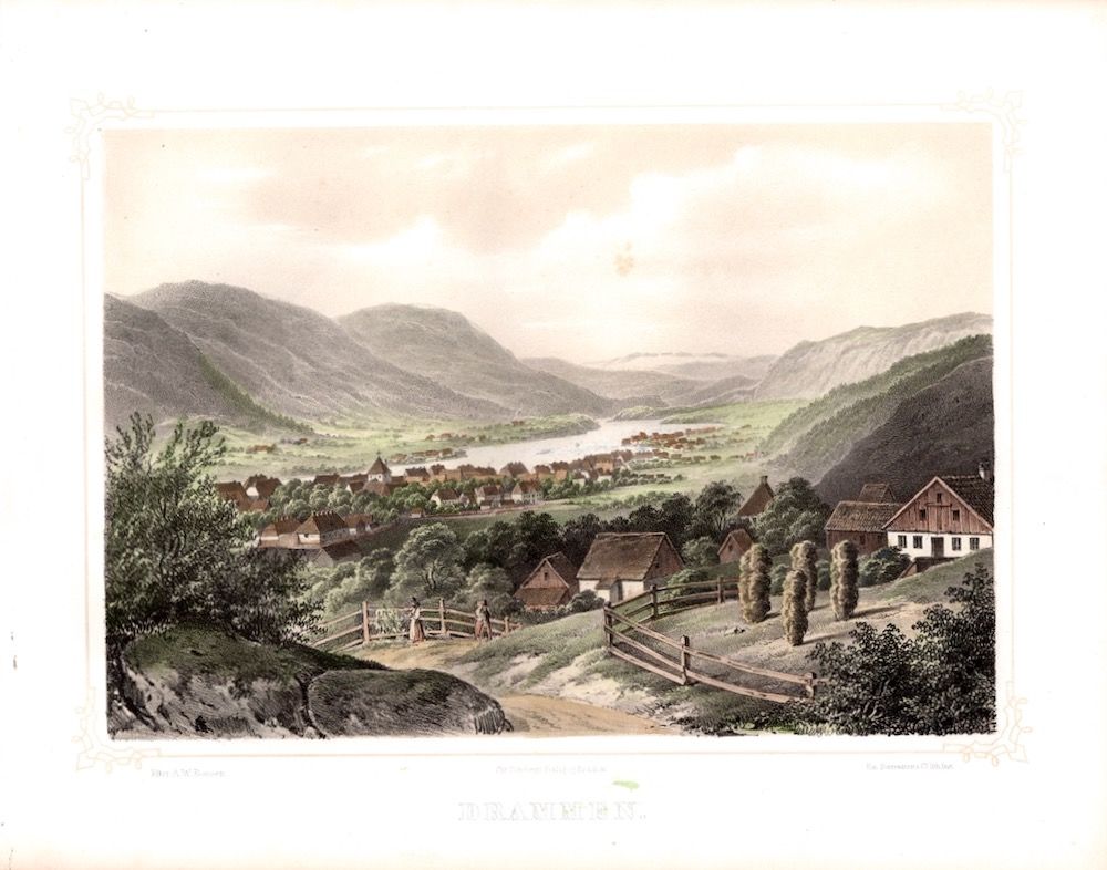 Litografi av “Drammen”. Efter A. W. Boesen. Hentet fra “Norge fremstillet i tegninger”.