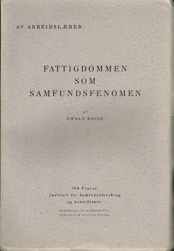 Oslo, 1939. 4to. (6) + 253 s. Originalomslag. Uoppskåret. Noe innbøyde kanter, ellers pen.. (ISA forlag Institutt for Samfunnsforskning og Arbeidslære). Sosiologen Ewald Bosses hovedverk, Arbeidslæren, utkom i 1927. Dette er således et bidrag til den teoretiske del av den boken. Ewald Bosse (1880-1956) var en av våre tidligste betydningsfulle sosiologer/økonomiske historikere. Bosse opprettet Institutt for samfunnsforskning og arbeidslære i Oslo 1937.