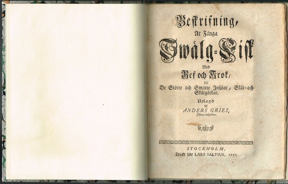 Beskrifning, At Fånga Swälg-Fisk Med Ref och Krok, Uti De Större och Smärre Insjöar, Skär- och Skärgårdar. Uplagd Af -./ Medbundet: Oförgripeliga Tankar Om Insjö-Fiskeri: I kårthet upfatte, i anledning af et nyligen påfunnit behändigt sätt, at fånga Gäddor, hwarigenom de kunna minskas i de större, och nästan utödas i en del mindre Sjöar.