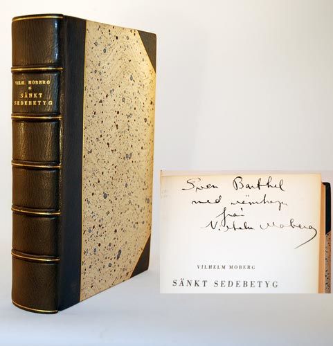 Stockholm; Bonniers, 1936. 441, (1) s. Gediget blågrönt halvfranskt band med fem upphöjda bind, sparsam ryggförgyllning, marmorerade pärmar och övre guldsnitt. Främre omslaget medbundet. (Nordiska Bokhandelns etikett). Lätt doft av piprök. Ryggen obetydligt blekt. Liten fläck på främre omslaget, samt en centimeterlång lagad reva i nedre marginal. Liten fläck i marginalen på s. 91-93, på s. 94 i texten. Fint ex. Dedikation: ""Sven Barthel med vänskap från Vilhelm Moberg""