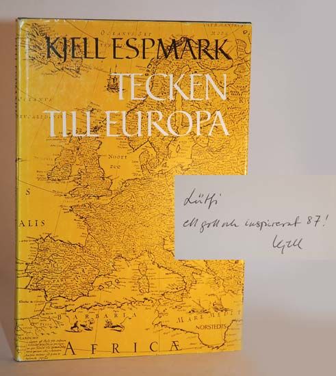 Stockholm; Norstedts, 1982. Originalupplaga. [22x15,5 cm]. 66, (2, 2 blanka) s. Förlagets pappband med skyddsomslag. Omslag av Karl-Erik Forsberg. Omslaget något blekt över ryggen samt något nött vid rygg- och pärmhörn, och med ett par minimala riss. En svag fläck på främre snittet. Den blanka s. [68] lätt solkad. Bra ex. Boken utgör andra delen av en trilogi som inleds med Försök till liv (1979) och avslutas med Den hemliga måltiden (1984), samtliga bestående av 12 längre dikter. Dedikation: ""Lütfi [Özkök] / ett gott och inspirerat 87! / Kjell"".