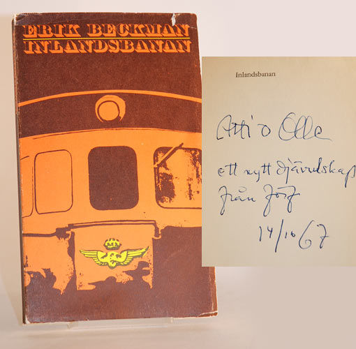 Stockholm; Bonniers, 1967. Originalupplaga. [19,5x12 cm]. 216, (1, 1 blank) s. Häftad. Omslag av Bernt Johansson. Huvudsakligen ouppskuren. Kort reva högst upp på främre omslag. Ryggändarna något nötta samt med en kort reva i övre framfals. På ett bifogat vikt ark som tagits ur en linjerad anteckningsbok har (troligen) Beckman skrivit med maskin: ""[Kl.] 14: 1965 juli 20. Nu är det A. [Hänvisning:] B""; [Kl.] 19: 1965 juli 20. Nu tycker jag att B. [Hänvisning:] C""; [Kl.] 8: 1965 juli 20. Nu ryckte C. [Hänvisning:] D""; [Kl.] 23: 1965 juli 20. Nu fann D. [Hänvisning:] A"". Dedikation: ""Atti o Olle / ett nytt djävulskap / från förf / 14/10 67"". Mottagaren Atti Johansson (1917-2003), konstnär och miljökämpe bosatt i Sollefteå. Hon var nära vän till Beckman och ritade omslag till endel av hans böcker. Beckman har behandlat hennes konstnärskap i essän ""Atti och Don Quijote. Konstnären Atti Johansson i ord och bild"" (Ord & Bild, 1987).