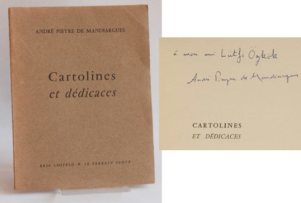 Paris; Eric Losfeld / Le Terrain Vague, 1960. 1st ordinary ed. 12:o. 45, (1, 2 blanks) pp. Original printed wrappers. A light crease at front cover. Fine. Pieyre de Mandiargues is most remembered for his filmed novels 'La Motocyclette' (1963), and 'La Marge' (1967); the latter won him the Goncourt Prize. Inscribed to the poet and photographer Lütfi Özkök: ""á mon ami Lütfi Özkök / André Pieyre de Mandiargues"".