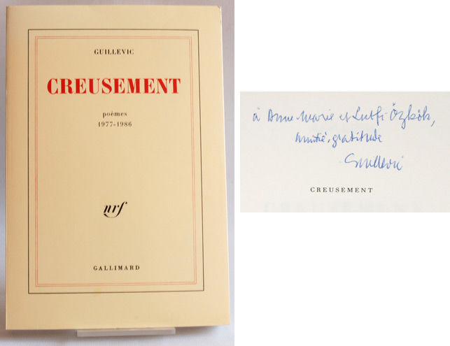 Paris; Gallimard, 1987. First edition on ordinary paper. 8:o. 186, (4, 2 blanks) pp. Original printed wrappers. Insignificant crease on the spine. Very fine. Poems in his typical laconic style, collected under the headings Source, Bretagne, Rendez-vous, Vertige, Urbaines, Lieux, and Sauvage. Inscribed to the poet and photographer Lütfi Özkök and his wife: ""à Anne-Marie et Lutfi Özkök, / amitié, gratitude / Guillevic"".