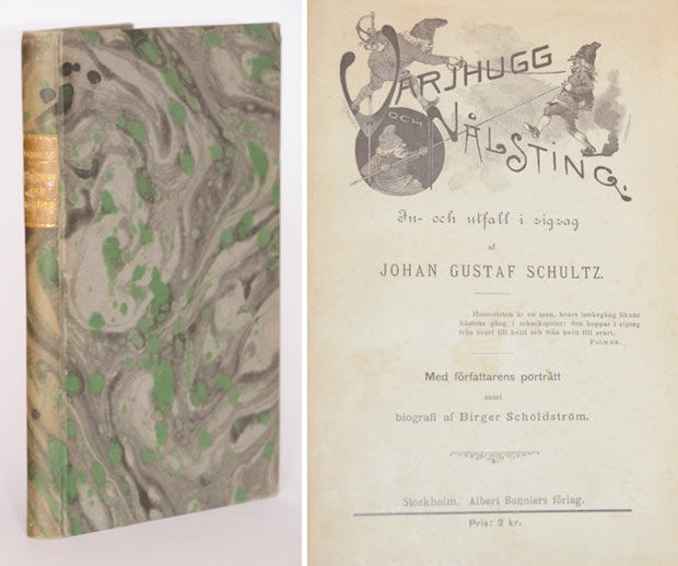 Stockholm; Bonniers, 1884. 19x13 cm. Porträttplansch + (4), 163, (1) s. Osignerat marmorerat pappband med titeletikett i brunt skinn. Omslaget medbundet. Rygghuvudet obetydligt nött. Titeletiketten lätt naggad. Några svaga fläckar på det medbundna främre omslaget; det bakre med några prickar i nedre marginalen. Porträttplanschen är fläckad och inlagan genomgående lätt fläckad. Schultz (1839-1869), vitterhetsidkare och publicist född i Urshult, Småland, som bl. a. redigerade ""Söndagsnisse"". I föreliggande samlingsvolym finns ""Kapten Batongs sägner"" (baserade på ""Fänrik Ståls sägner""), ""Skämtdikter och parodier"", ""Litet allvar bland skämtet"", ""Ur Nisses och Kapten Puffs arkiv"", samt ""Ungdomlga ströftåg inom publiciteten"".