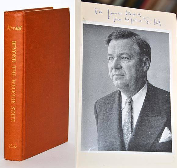 New Haven; Yale University Press, 1960. First edition. 22x15,5 cm. xii, (1, 1 blank), 287, (1 blank) pp. Original reddish-brown cloth, without the dustjacket. Spine slightly out of square, spine ends and corners a bit bumped. With an advertising slip from Routledge laid in, listing two other titles by Myrdal. In this book, based on the author’s Storr’s Lectures for 1958 at Yale University, Myrdal discusses the impact on world economy from the trend in the Western world towards economic planning. Inscribed by the author on front free endpaper: “For James Rössel from his friend G. M.”, and with a photo of Myrdal, measuring 17x13 cm, mounted below the inscription. With the recipient’s owner-label on front paste-down, and it is probably his pencil notations on several pages. James Rössel (1912-1998), Swedish author and translator. He translated several of Myrdal’s works into Swedish; his translation of Beyond the Welfare State (Planhushållning i välfärdsstaten) was published in 1961. Assarsson-Rizzi & Bohrn 322.