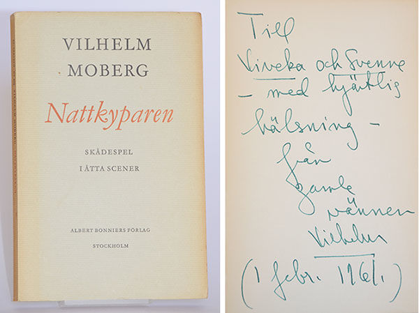 Stockholm; Bonniers, 1961. Originalupplaga. 19,5x13 cm. 148, (1, 1 blank) s. Häftad med tryckt omslag. Rygghuvudet lätt tilltryckt. Rygg, övre och främre snitten, samt en rand ytterst i främre omslagets yttermarginal gulnade av piprök. En liten mörk prick på främre omslag. I denna pjäs drar sig en äldre framgångsrik konstnär tillbaka till ett hotell för att begå självmord, men finner slutligen ny livslust genom konsten. Dedikation till vännen och författaren Sven Barthel och hans fru Viveka Starfelt: ""Till Viveka och Svenne -- med hjärtlig hälsning -- från gamle vännen Vilhelm / 1 febr. 1961"". In this play, ""The Noght Porter"", an elderly, successful painter, disgusted by the thought of his own ageing, withdraws to a cheap hotel to commit suicide, but eventually finds relief through art. Inscribed by the author to his friends Sven Barthel and Viveka Starfelt.