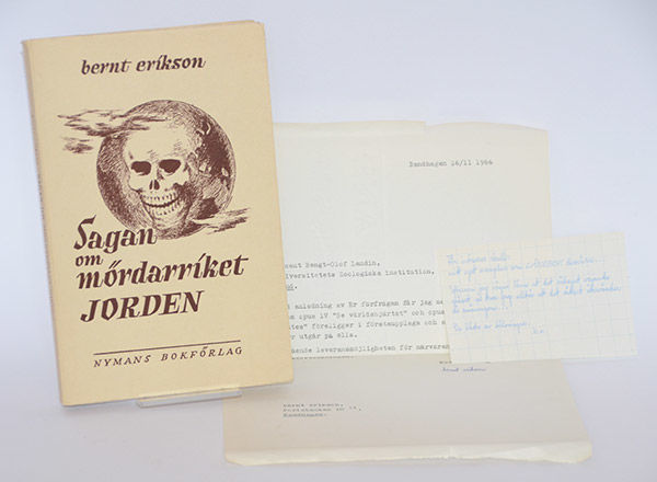 Edsviken; Nymans Bokförlag, 1946. Originalupplaga. 21,5x13,5 cm. 141, (2, 1 blank) s. Häftad med tryckt omslag. Rygghuvudet aningen tilltryckt. Fint ex. Boken utgavs i 300 exemplar, varav 100 numrerats och signerats av författaren; detta är osignerat. Med ett bifogat maskinskrivet och signerat brev från författaren till Lundazoologen och boksamlaren Bengt-Olof Landin, daterat 16/11 1966. Erikson talar i brevet om vilka av hans egna böcker som f. n. finns till försäljning och hänvisar till en bifogad verkförteckning som dock inte finns med här. På en lapp rutat papper har Erikson gjort följande tillägg: ""För intresses skull: mitt eget exemplar som LÅNEBOK dessvärre... Eftersom jag vågar låna ut det sällsynt vajande gräset så tror jag alltså att det säkert återvänder så småningom... De bästa av hälsningar. / b. e.""