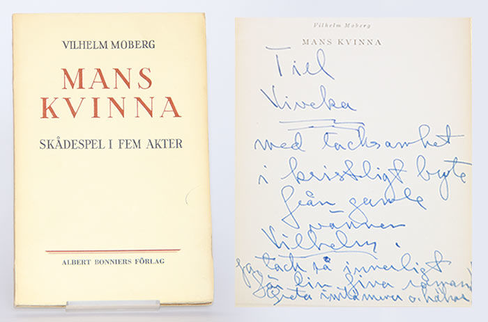 Stockholm; Bonniers, 1943. Originalupplaga. 19,5x12,5 cm. 181, (1) s. Häftad med tryckt omslag. Ouppskuren. Ryggen något mörknad och med två ytliga sprickor. Främre omslaget med ett litet bläckstreck samt ett riss i yttermarginalen. Nedre omslagskanterna aningen veckade. Gammal prislapp på bakre omslag. Pjäsen som bygger på romanen med samma namn, publicerad 1933, blev även filmatiserad (1945). Dedikation: ""Till Viveka med tacksamhet / i kristligt byte från gamle vännen Vilhelm / ja, tack så innerligt för din fina roman! / Greta instämmer o. hälsar."" Mottagare var författaren Viveka Starfeldt (1906-1976), gift med Sven Barthel. Hon publicerade sin roman ""Porträtt av shinglad flicka"" detta år, vilken enligt dedikationen bytts mot detta exemplar av Mobergs pjäs.