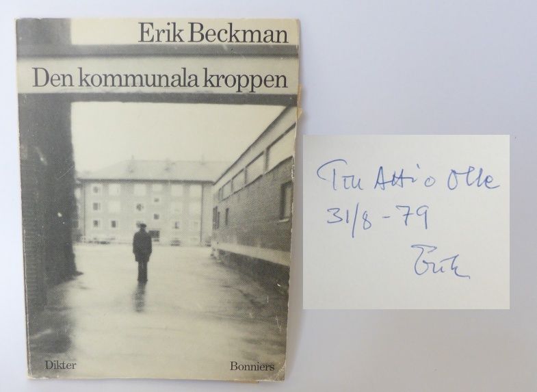 Stockholm; Bonniers, 1979. Originalupplaga. 22,5x16 cm. 43, (1, 2 blanka) s. Häftad med tryckt omslag. Omslagsfoto av Hans Ottosson. Främre omslaget med aningen nötta kanter, bakre omslaget lätt solkat. Första blanka sidan svagt gulnad av ilagt tidningsurklipp (Magnus Ringgrens recension av boken ur Expressen). Dedikation: ""Till Atti o Olle / 31/8 -79 / Erik"". Mottagaren Atti Johansson (1917-2003), konstnär och miljökämpe bosatt i Sollefteå. Hon var nära vän till Beckman och ritade omslag till endel av hans böcker. Beckman har behandlat hennes konstnärskap i essän ''Atti och Don Quijote. Konstnären Atti Johansson i ord och bild'' (Ord & Bild, 1987).
