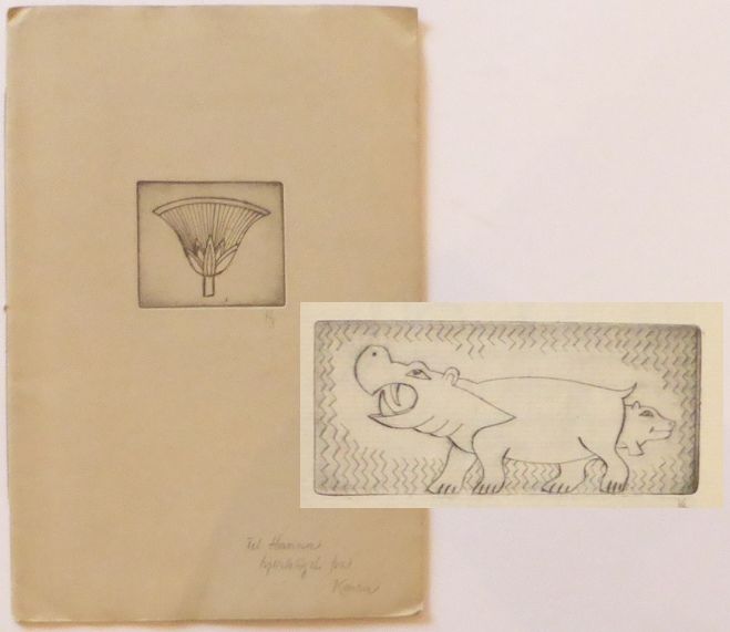 Copenhagen; Fr. Bagges kgl. Hofbogtrykkeri, 1954. 24,5x16,5 cm. (6, 2 blanks) pp. Original printed wrappers. The wrappers are slightly creased at the corners, as are most leaves. Contents are bright and clean. With six illustrations in drypoint (including the wrappers). The Danish artist Karen Lis Jacobsen (1905-1989) was mainly occupied with zoological motives and made several travels in Egypt, where she found inspiration for exhibitions and book projects, such as the present, which revolves around the princess tomb in Sakkarah. The book was issued in just 50 copies, and is inscribed by Jacobsen in pencil on front wrapper: ""Till Hanna / hjerteligst fra / Karen"".