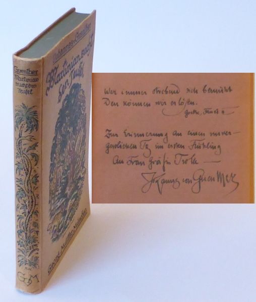München; Georg Müller, 1916. First edition. 21x14,5 cm. 283, (4, 1 blank) pp. Publisher's illustrated boards with green top edge. Illustrations by Rolf von Hoerschelmann. The boards are a bit toned and stained, and a little bowed, foot of spine is bumped and there is a small pressure mark on rear board. Contents are fine. The novel, written in the manner of old legends, depicts a saint being tempted by demons. Inscribed by the author to Swedish countess (Gräfin) Alice Trolle (1872-1953).