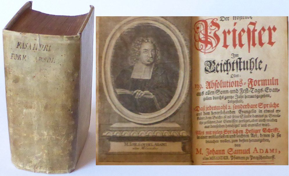 Dresden; Bey Joh. Christoph Zimmermann, 1718-1723. 8:o. 17,5x12 cm. Frontispiece, (13, 1 blank), 864 & (7, 1 blank), 736 pp. Contemorary vellum with title in handwriting on spine, red edges. Signature of Swedish vicar Torsten Hildebrand Svartengren (1847-1920) on front free endpaper and on the first title leaf. There are short cracks at spine ends and the binding is a bit soiled. The first part has a loss at lower corner on pp. 163/164 and a mending in lower margin on pp. 179/180. There are a few small scattered specks in both parts. A very well-preserved copy. The two parts were originally published in 1694 and 1710, respectively.