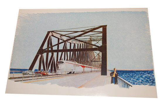 Förslag till bro över Öresund för Landsvägs- och järnvägstrafik mellan Hälsingborg och Helsingör.