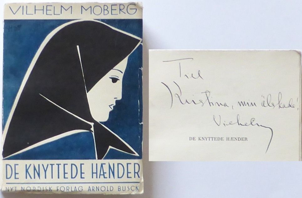 Köpenhamn; Nyt Nordisk Forlag / Arnold Busck, 1935. Originalets titel: De knutna händerna (Stockholm, 1930). 20,5x15 cm. 304 s. Häftad med tryckt omslag. Det överdimensionerade omslaget är veckat samt har några riss vid ryggfoten och i yttre och nedre marginalerna. Två blad med liten hörnförlust upptill, annars en fin inlaga. Första danska utgåvan. Dedikation: ""Till Kristina, min älskade! / Vilhelm"". Mottagaren Kristina Odelberg/Hedenblad (1917-2005) hade under 40-talet och möjligen även senare en kärleksaffär med Moberg, som döpte Kristina i Utvandrarserien efter henne. Kärleksaffären upptäcktes via en svit om 30 böcker som Moberg dedicerat till henne. I exemplaret av Utvandrarna (1949) skriver han: ”Till Kristina, min älskade, som lånat sitt namn åt den kvinnliga huvudpersonen i denna bok, med tacksamhet och kärlek från Författaren”, ett intyg som upprepas så sent som 1969 i pocketupplagan av Utvandrarserien: ” Den 29/3 1969. / Till Kristina -- hon som givit sitt namn åt den kvinnliga huvudpersonen i utvandrarromanen och till Minnet / med innerlig tillgivenhet från Författaren”, vilket visar att hon var fullt närvarande i hans tankevärld under hela denna tid och därmed mycket väl kan ha påverkat hans senare litterära produktion. Vad som ytterligare talar för detta är exemplaret av Vår ofödde son, en pjäs från 1945 som behandlar abort-problematik. Detta är den enda av böckerna som Kristina låtit binda in i ett påkostat rött skinnband, med en pärmficka längst bak där hon samlat tidningsartiklar om boken och dess författare. I Kristinas exemplar av den danska utgåvan av samma bok, utgiven 1947, finns en dedikation från översättaren: ”Kaera Kristina! / Denne Bog, den til Dels handler om dig, sendes dig til Erindring -- ikke om Forfattaren, men om Oversatteren. / Din Carl Erik"".