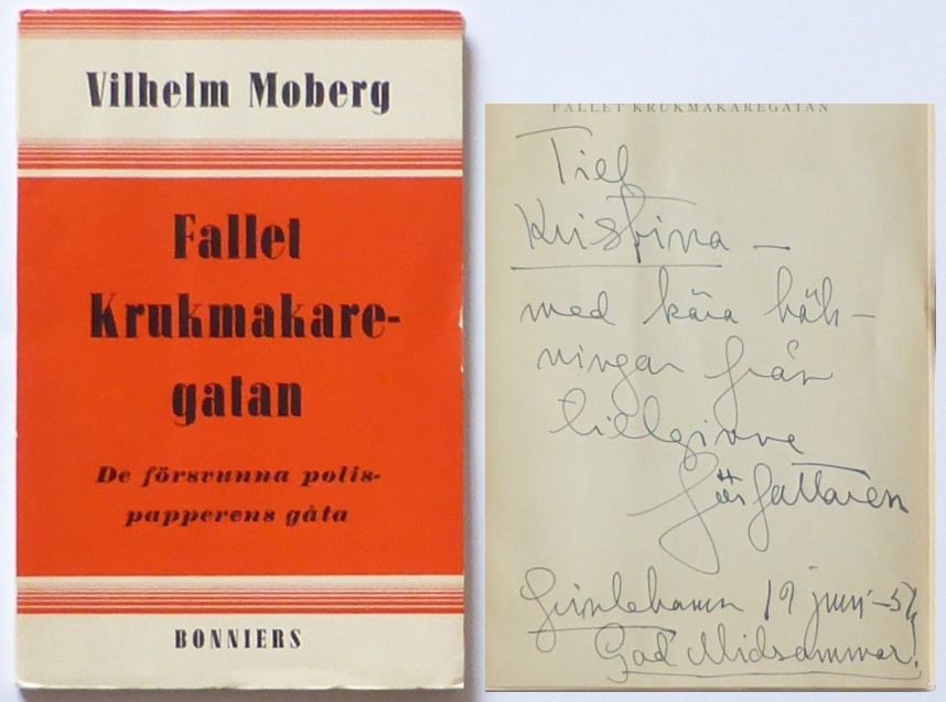 Stockholm; Bonniers, 1951. Originalupplaga. 19,5x13 cm. 62, (1, 1 blank) s. Häftad med tryckt omslag. Ouppskuren. Fint ex. Dedikation: ""Till Kristina -- med kära hälsningar från tillgivne författaren / Grisslehamn 19 juni -51 / God Midsommar!"". Mottagaren Kristina Odelberg/Hedenblad (1917-2005) hade under 40-talet och möjligen även senare en kärleksaffär med Moberg, som döpte Kristina i Utvandrarserien efter henne. Kärleksaffären upptäcktes via en svit om 30 böcker som Moberg dedicerat till henne. I exemplaret av Utvandrarna (1949) skriver han: ”Till Kristina, min älskade, som lånat sitt namn åt den kvinnliga huvudpersonen i denna bok, med tacksamhet och kärlek från Författaren”, ett intyg som upprepas så sent som 1969 i pocketupplagan av Utvandrarserien: ” Den 29/3 1969. / Till Kristina -- hon som givit sitt namn åt den kvinnliga huvudpersonen i utvandrarromanen och till Minnet / med innerlig tillgivenhet från Författaren”, vilket visar att hon var fullt närvarande i hans tankevärld under hela denna tid och därmed mycket väl kan ha påverkat hans senare litterära produktion. Vad som ytterligare talar för detta är exemplaret av Vår ofödde son, en pjäs från 1945 som behandlar abort-problematik. Detta är den enda av böckerna som Kristina låtit binda in i ett påkostat rött skinnband, med en pärmficka längst bak där hon samlat tidningsartiklar om boken och dess författare. I Kristinas exemplar av den danska utgåvan av samma bok, utgiven 1947, finns en dedikation från översättaren: ”Kaera Kristina! / Denne Bog, den til Dels handler om dig, sendes dig til Erindring -- ikke om Forfattaren, men om Oversatteren. / Din Carl Erik"".