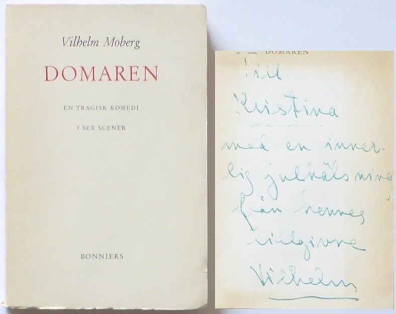 Stockholm; Bonniers, 1957. Originalupplaga. 19,5x13 cm. Ryggfoten lätt naggad. Svagt vikmärke vid främre omslagets övre hörn. Deltitelbladet något gulnat av ilagt tidningsurklipp. Fin inlaga. Dedikation: ""Till Kristina med en innerlig julhälsning från hennes tillgivne Vilhelm"". Mottagaren Kristina Odelberg/Hedenblad (1917-2005) hade under 40-talet och möjligen även senare en kärleksaffär med Moberg, som döpte Kristina i Utvandrarserien efter henne. Kärleksaffären upptäcktes via en svit om 30 böcker som Moberg dedicerat till henne. I exemplaret av Utvandrarna (1949) skriver han: ”Till Kristina, min älskade, som lånat sitt namn åt den kvinnliga huvudpersonen i denna bok, med tacksamhet och kärlek från Författaren”, ett intyg som upprepas så sent som 1969 i pocketupplagan av Utvandrarserien: ” Den 29/3 1969. / Till Kristina -- hon som givit sitt namn åt den kvinnliga huvudpersonen i utvandrarromanen och till Minnet / med innerlig tillgivenhet från Författaren”, vilket visar att hon var fullt närvarande i hans tankevärld under hela denna tid och därmed mycket väl kan ha påverkat hans senare litterära produktion. Vad som ytterligare talar för detta är exemplaret av Vår ofödde son, en pjäs från 1945 som behandlar abort-problematik. Detta är den enda av böckerna som Kristina låtit binda in i ett påkostat rött skinnband, med en pärmficka längst bak där hon samlat tidningsartiklar om boken och dess författare. I Kristinas exemplar av den danska utgåvan av samma bok, utgiven 1947, finns en dedikation från översättaren: ”Kaera Kristina! / Denne Bog, den til Dels handler om dig, sendes dig til Erindring -- ikke om Forfattaren, men om Oversatteren. / Din Carl Erik"".