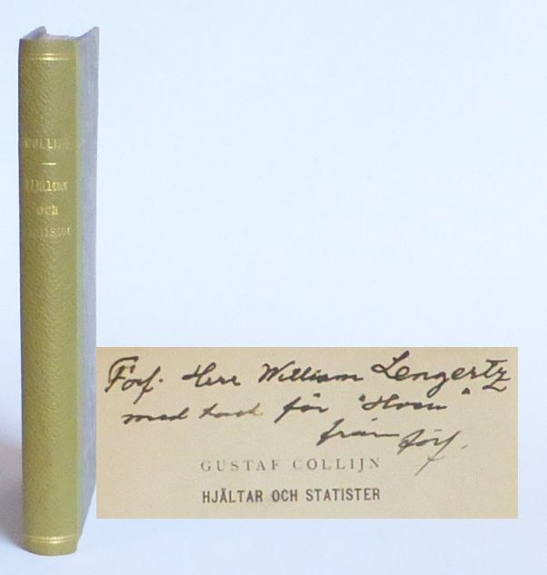 Stockholm; Bonniers, 1917. Originalupplaga. 16,5x11,5 cm. 173, (1 blank) s. Samtida grönt halvklotband med förgylld ryggtitel, marmorerade pärmpapper och stänkmålade snitt. Omslaget medbundet. Ryggfoten aningen tilltryckt. Fint ex. Collijn (1880-1968), dramatiker, grundare av och ledare för Nya Intima Teatern 1914-1921 och ledare för Djurgårdsteatern, författare av ett fåtal prosaverk, varav det föreliggande hämtar sitt stoff från hans erfarenheter som teaterman. Dedikation till antikvariatsbokhandlaren William Lengertz: ""Förf. Herr William Lengertz med tack för 'Hven' / från förf."", samt med mottagarens exlibris. Även framsidan av det brev som boken troligen skickats i är medbunden. Dedikationens ""Hven"" syftar på Lengertzs utgivna skrift ""Hven: Tycho Brahes ö"" (1923).