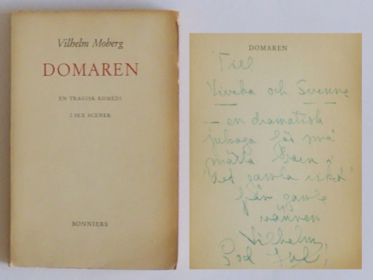 Stockholm; Bonniers, 1957. Originalupplaga. 19,5x13 cm. Rygg, omslagsmarginaler samt övre och yttre snitten något gulnade at piprök. En fläck på bakre omslag. Det överdimensionerade omslaget är lätt veckat i nedre marginalerna samt vid ryggfoten. Fin inlaga. Dedikation till vännerna Sven Barthel och Viveka Starfelt: ""Till Viveka och Svenne -- en dramatisk julsaga för små snälla barn i 'det gamla riket' från gamle vännen Vilhelm, God Jul.""