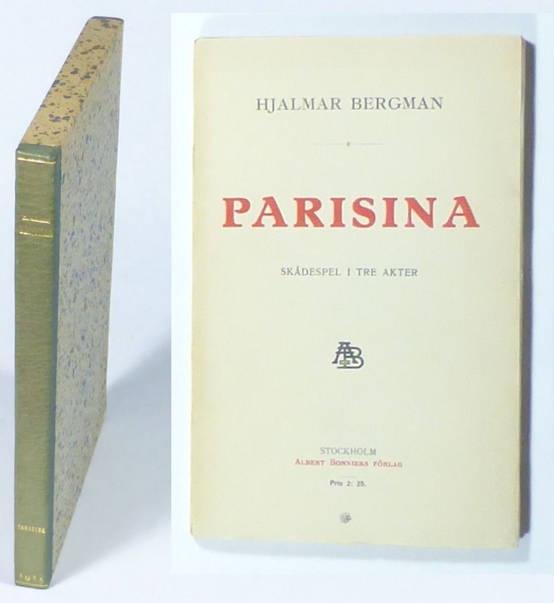 Stockholm; Bonniers, 1915. Originalupplaga. 19,5x13 cm. 107, (1 blank) s. Häftad med tryckt omslag. Ryggen något nött samt med ett par nedlimmade revor. Stjärnformad bokhandelsstämpel på främre omslag. Hörnförlust upptill på s. 9/10 p. g. a. slarvig uppskärning. I en blå marokängkassett med marmorerade pärmar och förgylld ryggtitel. Kassettens rygg är blekt till grönt. Historiskt drama kring Parisina Malatesta som utspelar sig i Ferrara år 1425.