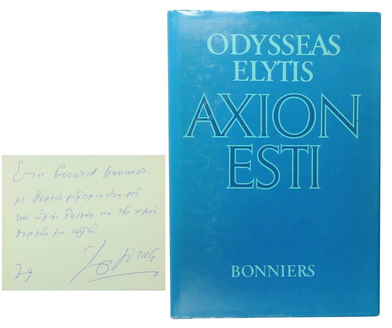 Stockholm; Bonniers, 1979. 23,5x16 cm. 101, (1) pp. Publisher's boards with printed dustjacket. The jacket is slightly faded at spine and a trifle worn at corners. A fine copy of the first Swedish edition. Inscribed in Greek by the author, during his visit to Sweden when collecting the Nobel Prize for literature, to his Swedish publisher Gerard Bonnier, saying ""to Gerard Bonnier with warm thanks for the beautiful edition [the book in question] and my warmest regards / 79 / Elytis"".
