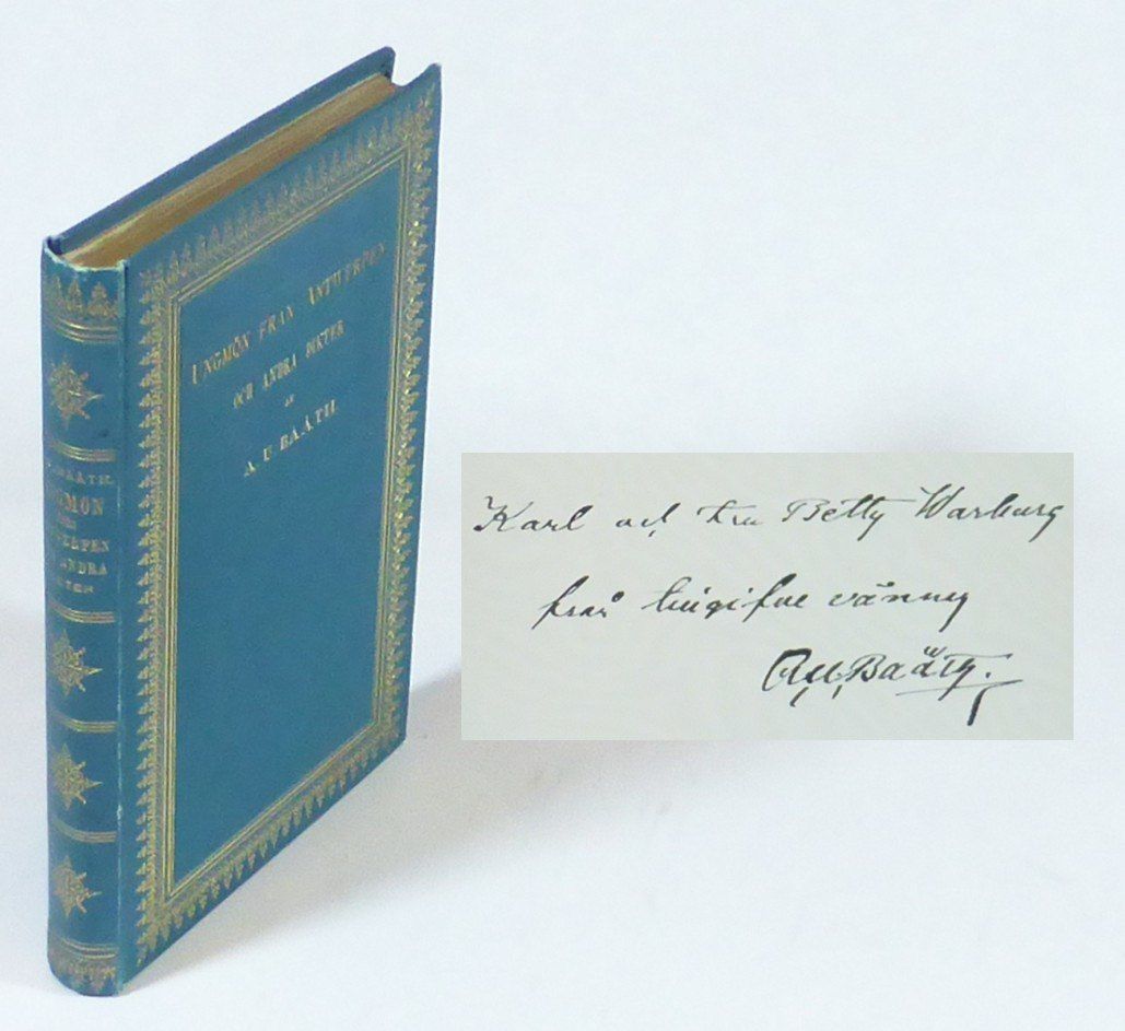 Stockholm; Bonniers, 1922. Originalupplaga. 19x13 cm. 115, (1 blank) s. Samtida grönt halvklotband (Hedberg) med ryggetikett I rött skinn, förgylld blomma på ryggen, marmorerade pärmpapper och snitt. Omslaget medbundet. Exlibris för Adolf och Louise Krusenstjerna samt namnteckning på halvtitelbladet (Mathilda Lagerbring). Ryggetiketten något nött. Fint ex. Innehåller även Hedbergs översättningar av Conrad Ferdinand Meyer, Theodor Storm, Vilhelm von Scholz och Leo Greiner.