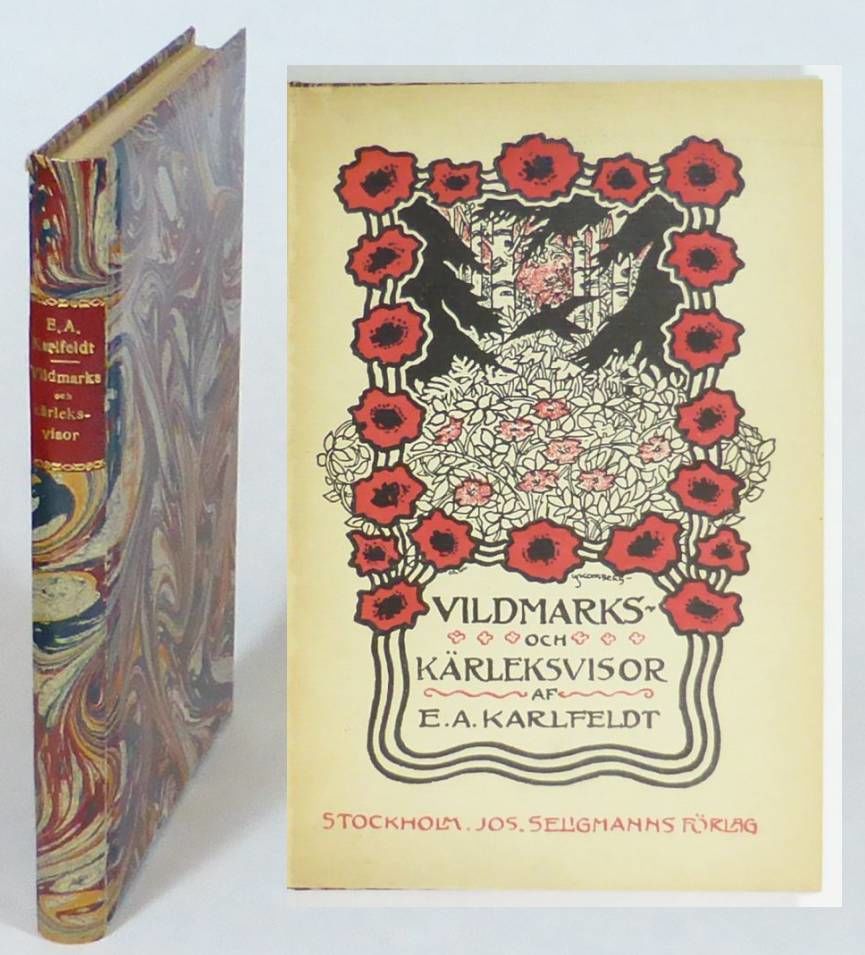 Stockholm; Jos. Seligmanns förlag, 1902. 19x13 cm. (5, 1 blank), 120 s. Senare marmorerat pappband med ryggetikett i rött skinn. Omslaget medbundet. Omslag av Lydia Skottsberg. Spricka i övre bakre fals samt i nedfe framfals. Inlagan med ett fåtal spridda små mörka prickar. Första upplagan av Karlfeldts debut utgavs 1895.