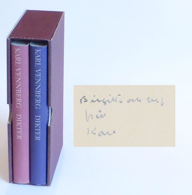 Stockholm; Bonniers, 1993. 22x14,5 cm. 281, (2, 3 blanka) & (3, 1 blank), 289-589, (2, 3 blanka) s. Två volymer i förlagets pappband med tryckta skyddsomslag. I pappkassett. Andra volymens skyddsomslag med ett veck samt ett riss vid ryggfoten. Fint ex. Dedikation i första volymen: ""Birgitta och Ulf [Trotzig] från Karl"". Fin association.