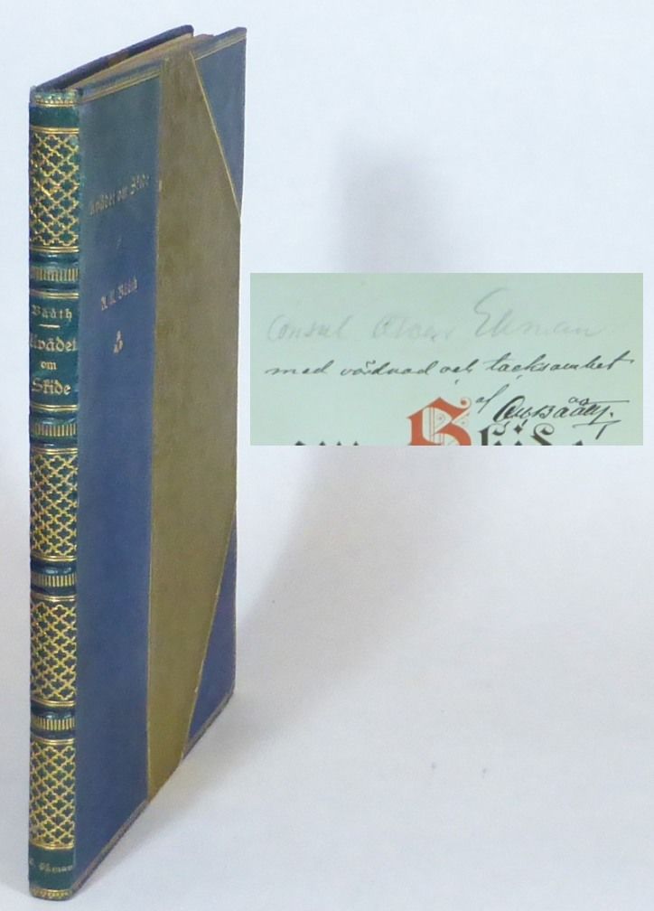 Stockholm; C. & E. Gernandts, 1896. 25x18 cm. (5, 1 blank), 81, (1) s. Samtida elegant blått halvmarokängband med rik ryggförgyllning, förgylld titel på rygg och främre pärm, reliefmönstrat guldfärgat pärmpapper, övre guldsnitt och med övriga snitt oskurna. Försättsblad i blått siden med förgyllt riksvapnet som dekor. Främre omslaget medbundet. Med tryckt dedikation till konsuln m. m. Oscar Ekman. Rygg och pärmhörn obetydligt nötta. Fint ex. Bååth (1853-1912), poet och docent i fornnordisk litteratur vid Göteborgs högskola. Detta dikturval är avsett att visa på den satiriska ådran i nordisk medeltidsdiktning och innehåller förutom titeldikten ""Mickels drapa"" samt ""En historia om Peder smed och Atser bonde"". Dedikation på främre omslag: ""med vördnad och tacksamhet af A. U. Bååth"". Mottagarens namn, Oscar Ekman, tillagt med blyerts, samt med namnet tryckt nederst på bokryggen. Ekman (1812-1907), affärsman, mecenat som spelade en viktig roll som donator vid framväxten av Göteborgs högskola, vilken ägnade honom en festskrift 1898.
