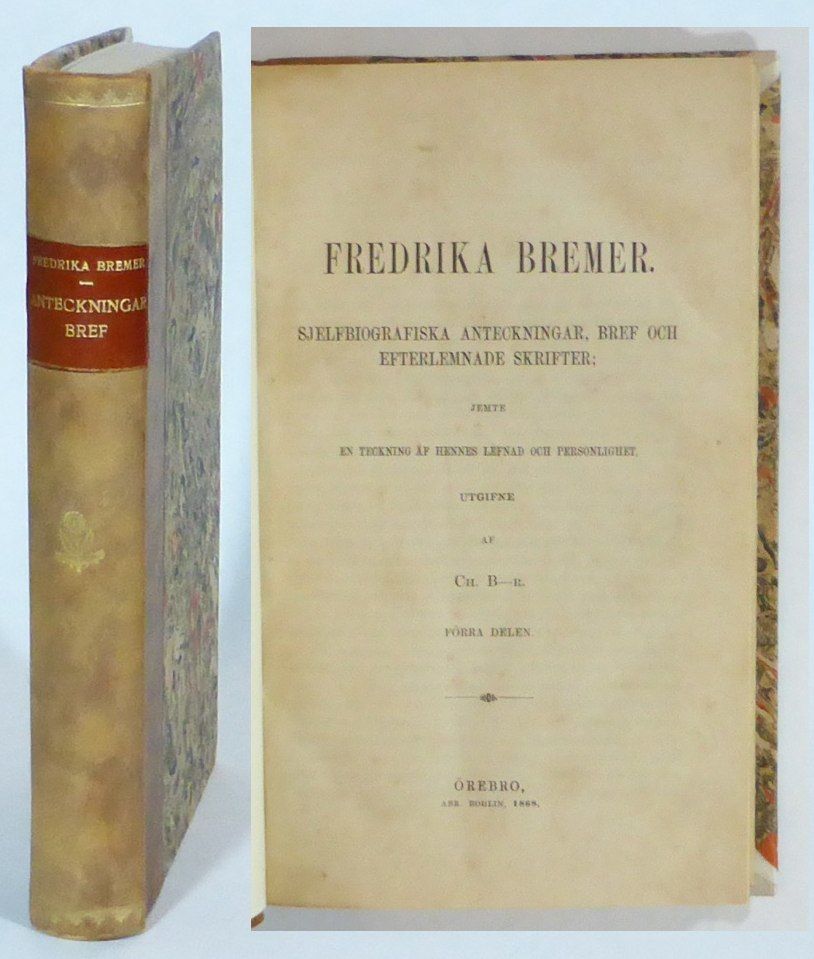 Örebro; Abr. Bolin, 1868. 20,5x13,5 cm. (1, 1 blank), 284, (1, 1 blank) & (1, 1 blank), 177, (2, 1 blank) s. Senare brunt halvfranskt band (Lindskogs bokbinderi) med ryggetikett i rött skinn, marmorerade pärmpapper. Omslag ej medbundet. Med bokbindaren Stellan Lindskogs exlibris. Inlagan ställvis aningen fläckad. Ovanligt rent och snyggt ex. Innehåller en levnadsteckning av utgivaren, Fredrika Bremers syster. Leijonhufvud & Brithelli, Kvinnan inom svenska litteraturen intill år 1893, s. 41.