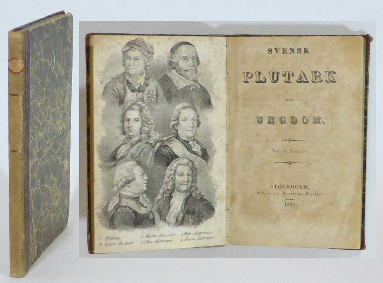 Stockholm; Elméns och Granbergs tryckeri, 1837. 8:o. 17,5x11,5 cm. (1, 1 blank), 135, (1) s. + 6 planschblad. Samtida brunt halvklotband med två pappersetiketter på ryggen, marmorerade pärmpapper. Rygg och etiketter blekta, ryggändar och pärmhörn något tilltryckta. Inlagan ställvis fläckar och med spridda hörnveck. Nyare namnteckning på främe försättsblad. Korta biografier över namnkunniga svenskar efter Plutarchos' modell, troligen har arbetet inspirerats av Johan Fredrik af Lundblads ""Svensk Plutark"" som utgavs åren 1823-1831.