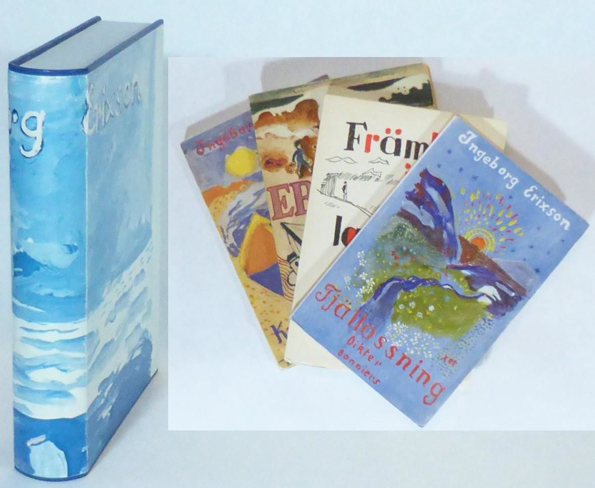 Stockholm; Bonniers, 1945-1951. Originalupplagor. 19,5x13 resp. 20,5x14 cm. 57, (3, 2 blanka) & 86, (3, 1 blank) & 89, (1) & 84, (3, 1 blank) s. Fyra häftade volymer med omslag av författarens make Sven X:et Erixson. Ouppskurna. Tjällossning med lätt tilltryckt ryggfot och lätta hörnveck på omslaget. Kustlandskap med minimal förlust vid ryggfoten och en fuktfläck längst ned på ryggen. De överdimensionerade omslagen på de sista två arbetena med lite veckade yttre och nedre marginaler, samt ett fåtal riss i marginalerna. Fin uppsättning av Erixsons fyra första böcker i originalupplagor, huserade i en dekorerad pappkassett (Arne Nilsson). Svenskt litteraturlexikon sammanfattar Erixsons poesi: ""... har Erixson framträtt med en kvinnligt intuitiv, besjälad poesi. Krafter och förlopp i naturen får avspeglingar i själens landskap; en mystisk upplevelse av enhet och evighet kan fattas som hennes grundtema.""