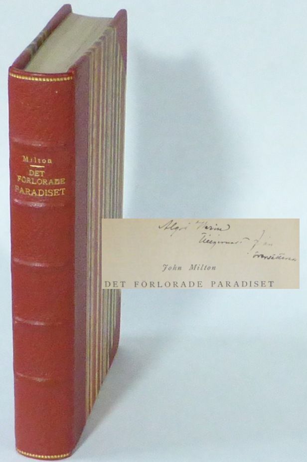 Stockholm; Natur och Kultur, 1926. (Levande litteratur). Originalets titel: Paradise Lost (1667). 20,5x13,5 cm. 336 s. Osignerat samtida rött halvfranskt band med förgylld ryggtitel och upphöjda bind, mönstrade pärmpapper. Omslaget medbundet; det bakre med några svaga fläckar samt mindre hörnveck. Med en lätt blyertsmarkering i yttermarginalen på c:a 15 sidor, samt några blyertsnoteringar med sidhänvisningar på s. 336. Fint ex. Första utgåvan av Bengtssons översättning och med en inledning av honom. Klassikerserien Levande litteratur redigerades av Alf Ahlberg som beställde Bengtssons översättning. I ett flertal brev till Algot Werin beklagar sig Bengtsson över det hårda arbetet med femfotajamber som dessutom kom att betala sig dåligt. Boken, liksom hela klassikerserien där den ingick, blev ingen försäljningsframgång. Bengtsson arbetade vidare för att förbättra sin översättning och räknade med ökat anslag för detta; istället kom en räkning från förlaget på utförda korrekturrättningar vilken åt upp hela honoraret. Senare samma år kunde den omarbetade versionen publiceras i Fredrik Bööks serie Världslitteraturen. Dedikation: ""Algot Werin / Tillgivnast från översättaren"". Werin (1892-1975), litteraturhistoriker, bibliotekarie och direktör för Gleerups Förlag; en av Bengtssons närmaste vänner under tiden i Lund som var honom behjälplig bl. a. vid utgivandet av de inledande diktsamlingarna. Arvidsson & Malmqvist: Frans G. Bengtsson. En bibliografi I:4.