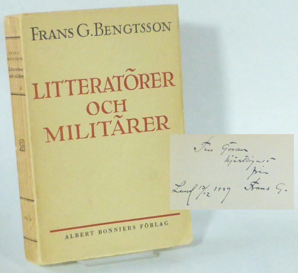 Stockholm; Bonniers, 1929. Originalupplaga. 19,5x13 cm. 317, (1, 2 blanka) s. Häftad med tryckt omslag. Exlibris för Anders Ollfors. Ryggen med läsränder och svaga fuktringar. Liten förlust vid rygghuvudet, kort reva i nedre bakre fals. Det överdimensionerade omslaget är aningen veckat i främre omslagets yttermarginal. En liten mörk prick på bakre omslag. En liten fläck på främre snittet är synlig i yttermarginalen på s. 219-238. Bra ex. Dedikation: ""Till Göran / Hjärtligast från Frans G. / Lund 13/12 1929"". Mottagare var med största sannolikhet Bengtssons gode vän Göran Lindblad (1894-1930), litteraturhistoriker, kritiker och litterär rådgivare på Norstedts från 1924. På ett löst bifogat vykort från antikvariatsbokhandlaren Gunnar Johanson-Thor till Anders Ollfors, intygar den förre att Lindblad är mottagaren och att exemplaret härrör från Lindblads brors bibliotek. Lindblad startade och redigerade Norstedts kalender PAN, där Bengtsson 1927 publicerade essän ""Promenad till en myrstack"". Detta uppmärksammades av Karl-Otto Bonnier som kontaktade Bengtsson med förslag om att ge ut en essäsamling på Bonniers. ""Litteratörer och militärer"" blev Bengtssons första essäsamling, vilken vidgade hans läsekrets och starkt tilltalade kritikerkåren. Arvidsson & Malmqvist: Frans G. Bengtsson. En bibliografi I:5.