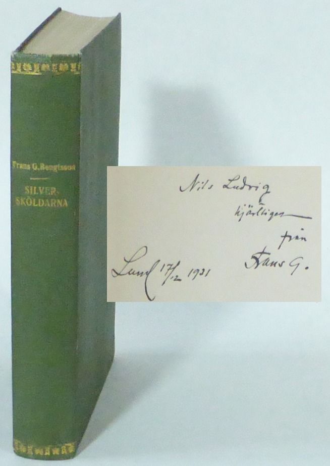 Stockholm; Bonniers, 1931. Originalupplaga. 19x13 cm. 330, (1, 1 blank) s. Samtida osignerat grönt klotband med förgylld ryggtitel och förgyllda bårder på ryggen. Främre omslaget medbundet. Obetydligt nötta ryggändar. Ett par svaga fläckar på främre snittet. En liten fläck på främre omslaget. En manuell rättning på s. 73, troligen av Bengtsson. Lätta blyertsmarkeringar i texten eller i yttermarginalen på drygt 60 sidor. Fint ex. Bengtssons andra essäsamling som ytterligare befäste hans ställning som landets främste i genren. Dedikation: ""Nils Ludvig / hjärtligen från Frans G. / Lund 17/12 1931"". Fin association. Mottagare var Bengtssons vän författaren Nils Ludvig Olsson (1893-1974), folkskollärare och som författare kallad endast Nils Ludvig. Olsson ger en fin beskrivning av Bengtsson i ""Frans G. Bengtsson. En minnesbok"" (1955). Arvidsson & Malmqvist: Frans G. Bengtsson. En bibliografi I:8.