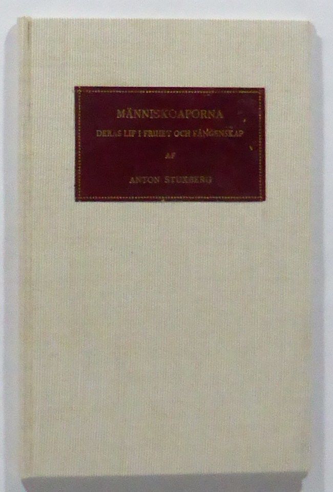 Göteborg; Wettergren & Kerber, 1892. 21,5x14 cm. (1, 1 blank), 31, (1 blank) s. Senare grått linneband med titeletikett i rött skinn på främre pärm. Främre omslaget medbundet. Den förgyllda titel med litet bortfall. Främre omslaget med ett skrapmärke i den inre marginalen. Fint ex. Behandlar gorilla, schimpans, orangutang samt gibbon.