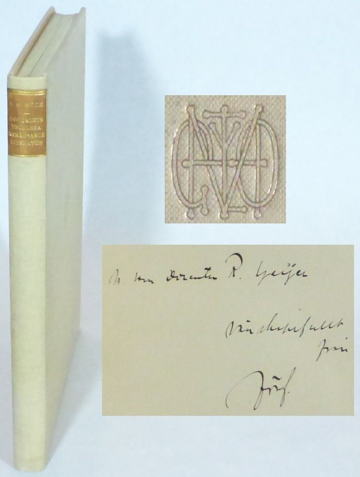 Uppsala; Akademiska boktryckeriet, Edv. Berling, 1882. Diss. 27x21,5 cm. (1, 1 blank), 166, (1, 1 blank) s. Senare ljusbrunt klotband (Bonniers Bokbinderi) med ryggetikett i mörkare brunt skinn, övre guldsnitt och med övriga snitt oskurna. Omslag ej medbundet. Med Thore Virgins förgyllda exlibris på främre pärmen samt stämplar från Bibliotheca Qvarnforsiana på främre innerpärm och främre försättsblad. Ryggetiketten aningen nött. Ett fåtal sidor med en liten mörk prick i marginalen. Fint ex. Boken trycktes i 335 exemplar, varav 60 på holländskt skrivpapper. Detta är ett av de 60 exemplaren. Med en dedikation från författaren till Karl Reinhold Geijer (1849-1922), som vid tillfället var docent i praktisk filosofi vid Lunds Universitet, där han 1888 blev professor i teoretisk filosofi.
