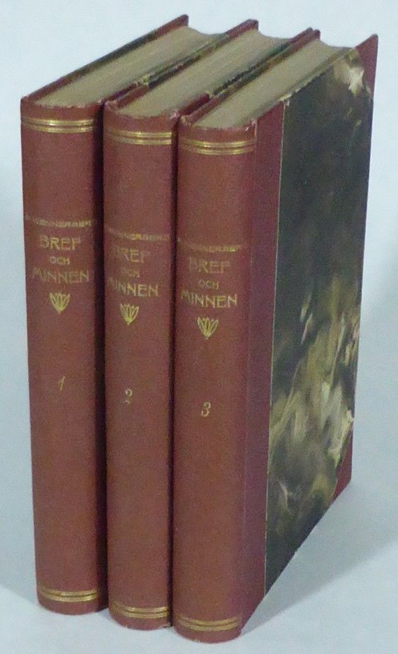 Stockholm; Gebers, 1913-1916. 19,5x14,5 cm. xvi, 333, (1 blank) s. + 4 planscher & viii, 332 s. + 4 planscher & viii, 319, (1 blank) s. + 8 planscher. Med illustrationer i texten. Tre samtida röda halvklotband med förgyllda ryggtitlar, marmorerade pärmpapper och mönstrade försättsblad. Omslag ej medbundna. Namnteckning på halvtitelbladet i första och tredje volymen (Sigrid von Bergen). Ett riss i yttermarginalen på s. 157/158 i andra volymen. Svag fuktfläck i yttermarginalen på s. 113-116 i tredje volymen. Fin uppsättning.