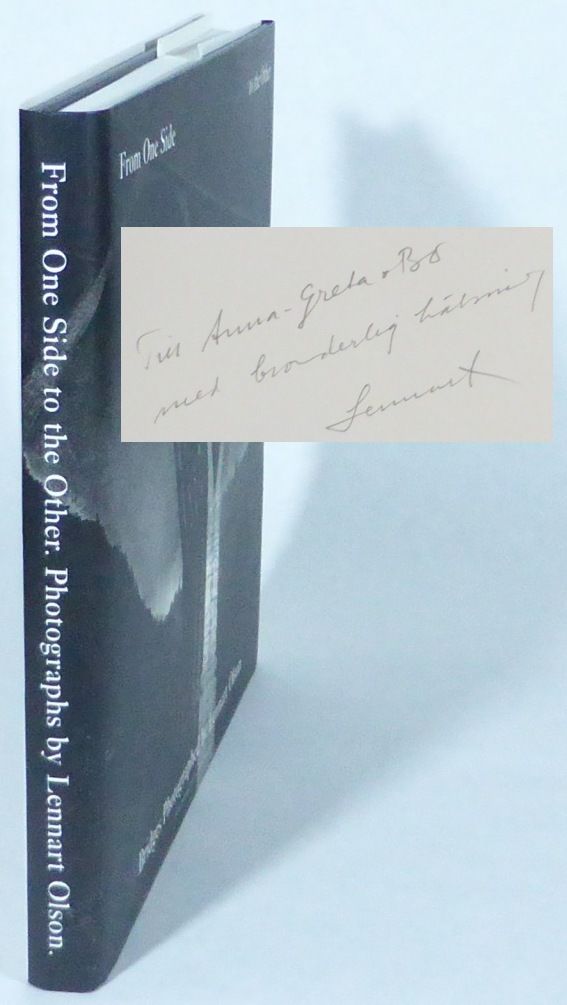 Stockholm; Byggförlaget, 2000. 28,5x30 cm. 161, (1, 2 blanks) pp. Publisher's boards with printed dustjacket. There is a light scrape mark on the jacket's front panel. A very fine copy. Contains the essay ""Bridges by Lennart Olson"", by Ulf Hård af Segerstad. Inscribed by Olson to his sister Anna-Greta and her husband on the first blank leaf.